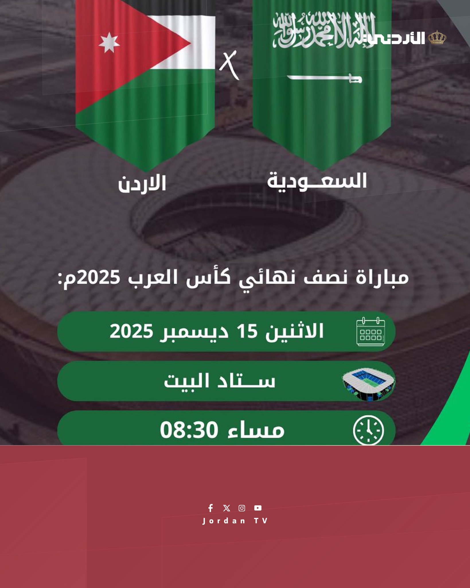 المنتخب الوطني ينهي تحضيراته الفنية والبدنية، تأهبا لمواجهة نظيره السعودي ضمن الدور نصف النهائي لبطولة كأس العرب فيفا 2025. مباراة اليوم : الأردن - السعودية 8:30 مساءً. استاد البيت. وأجرى المنتخب تدريبه الرسمي مساء أمس على ملاعب العقلة، بقيادة المدرب جمال سلامي لوضع اللمسات الأخيرة، إلى جانب تطبيق بعض الجمل التكتيكية للقاء اليوم. تعيين الحكم الباراغوياني "خوان غابرييل بينيتيز " حكماً لمباراة المنتخب الأردني والسعودي في نصف نهائي كأس العرب #الأردن