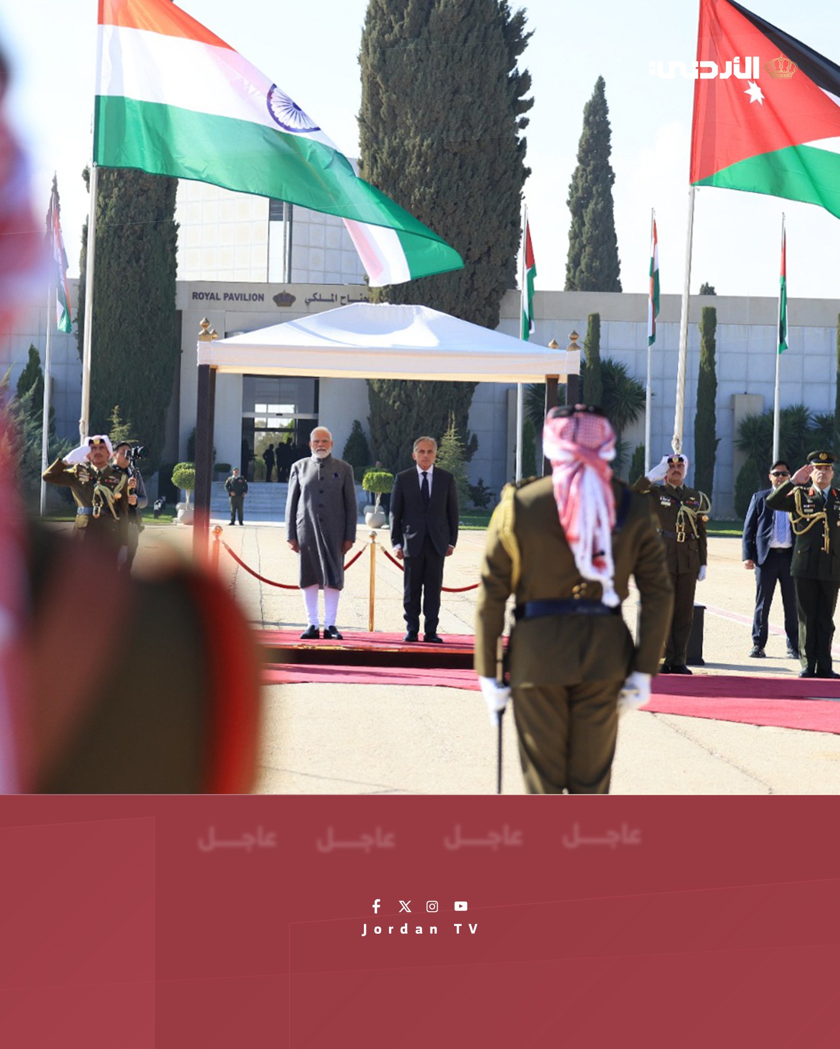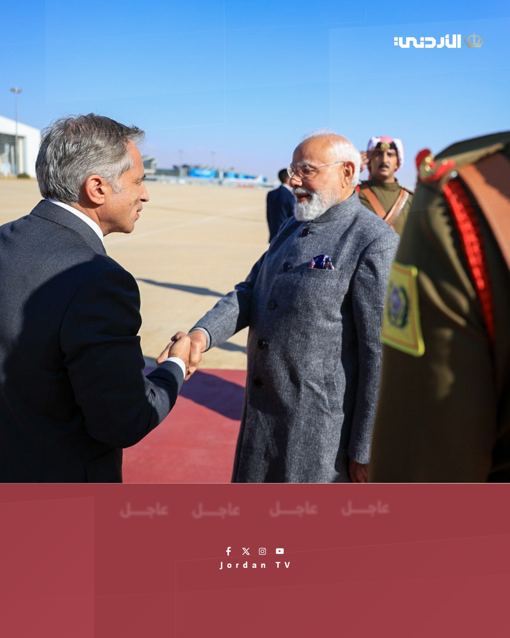 عاجل || رئيس الوزراء الدكتور جعفر حسان يستقبل رئيس وزراء جمهورية الهند ناريندرا مودي، الذي بدأ زيارة عمل رسمية إلى المملكة. وجرت للضيف مراسم استقبال رسمية لدى وصوله مطار الملكة علياء الدولي، حيث اصطفّ حرس الشرف لتحيته، وعزفت الموسيقى السلامين الجمهوري الهندي والملكي الأردني. عاجل الأردن التلفزيون الأردني JafarHassan