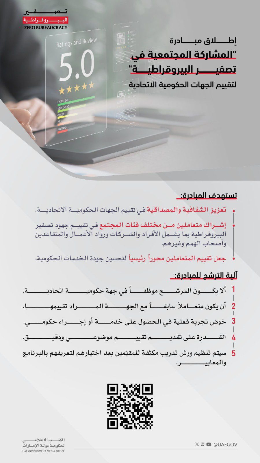 أطلقت حكومة دولة الإمارات مبادرة "المشاركة المجتمعية في تصفير البيروقراطية" لتقييم الجهات الحكومية الاتحادية، وتستهدف المبادرة تعزيز الشفافية والمصداقية في تقييم الجهات الحكومية الاتحادية، وإشراك متعاملين من مختلف فئات المجتمع في تقييم جهود تصفير البيروقراطية، وجعل تقييم المتعاملين محوراً رئيسياً، وفق آلية ترشيح تتضمن ألا يكون المرشح موظفاً في جهة حكومية اتحادية، وأن يكون متعاملاً سابقاً مع الجهة المراد تقييمها، وأن يكون قد خاض تجربة فعلية في الحصول على خدمة أو إجراء حكومي./ المكتب الإعلامي لحكومة دولة الإمارات