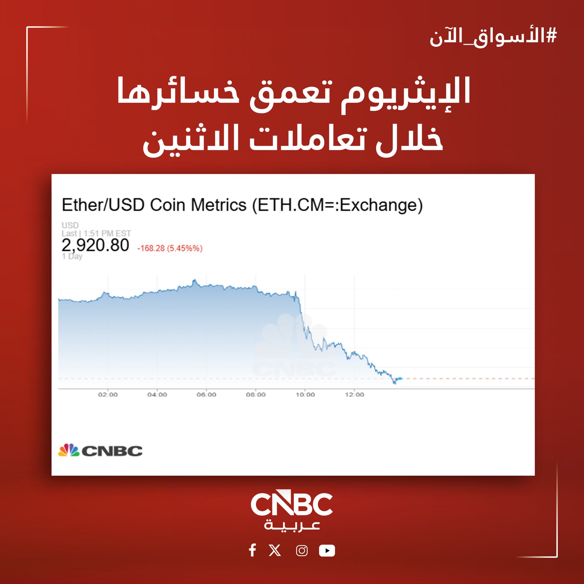 الإيثر توسع خسائرها، خلال تعاملات الاثنين 15 ديسمبر/ كانون الأول، لتفقد 9% من قيمتها في 8 ساعات مع استمرار عمليات التصفية. ثاني أكبر العملات المشفرة من حيث القيمة السوقية يتراجع بأكثر من 5% في أحدث التعاملات إلى مستويات دون الـ 3 آلاف دولار. البيتكوين تتراجع بأكثر من 3% في أحداث التعاملات إلى ما دون الـ 86 ألف دولار
