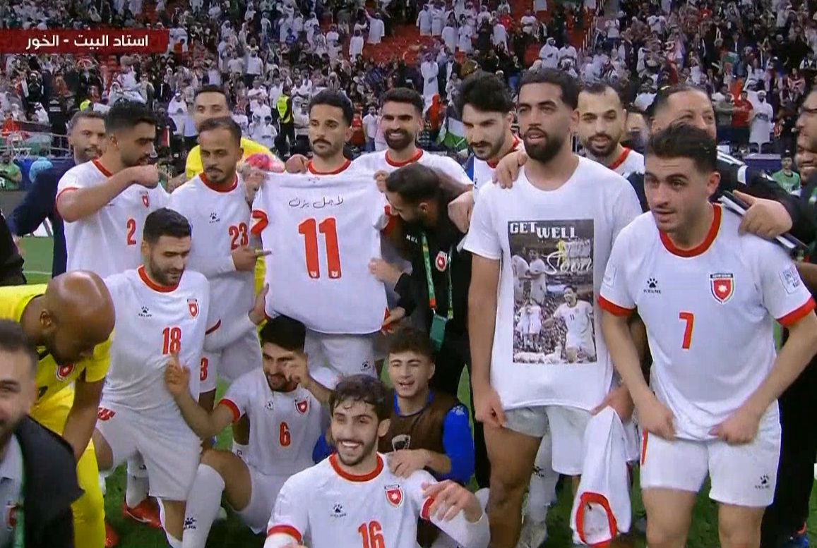 تعاهدوا على الفوز من أجله وقد صدقوا. لاعبو منتخب الأردن يحتفلون بقميص زمليهم المصاب يزن النعيمات بعدما حققوا التأهل إلى نهائي كأس العرب
