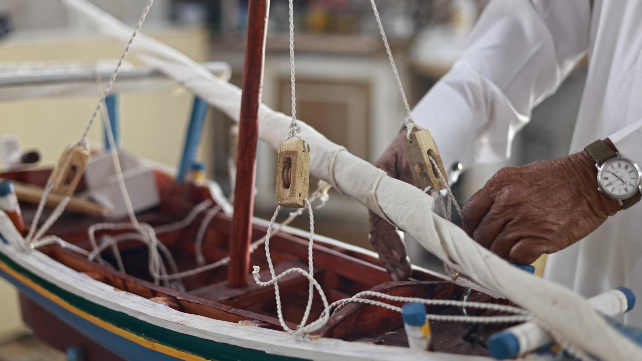 وتعلم "الحلواني" أصول الحرفة منذ صغره على أيدي صناع السفن القدامى، وواصل مسيرته رغم تراجع الاعتماد على السفن الشراعية مع تطور وسائل النقل الحديثة، ليحوّل خبرته إلى أعمال فنية توثّق هذا الإرث باستخدام الأخشاب المحلية وتقنيات البناء المتوارثة.
