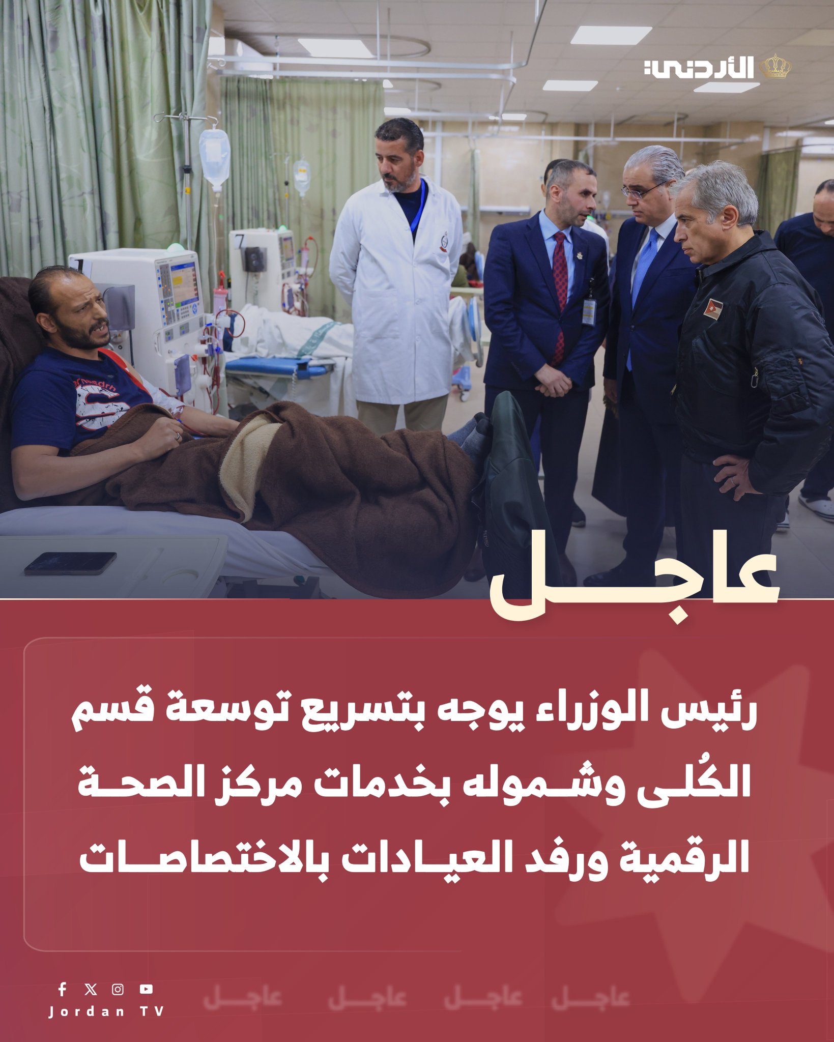 عاجل || رئيس الوزراء الدكتور جعفر حسان يزور مستشفى الأمير الحسين بن عبدالله الثَّاني في لواء عين الباشا. حسان يوجه بتسريع توسعة قسم الكُلى، وشموله بخدمات مركز الصحة الرقمية، ورفد العيادات بالاختصاصات النوعية #عاجل