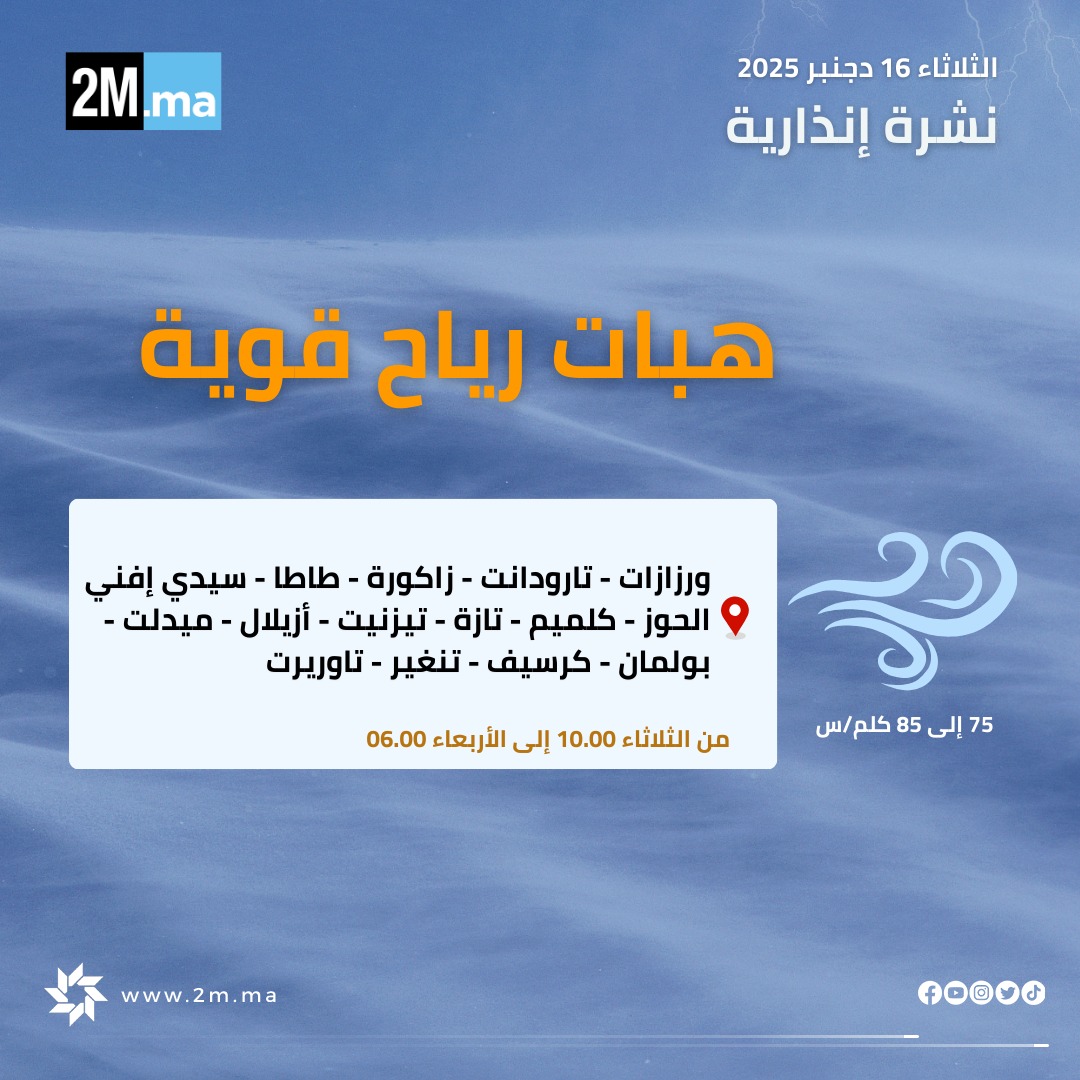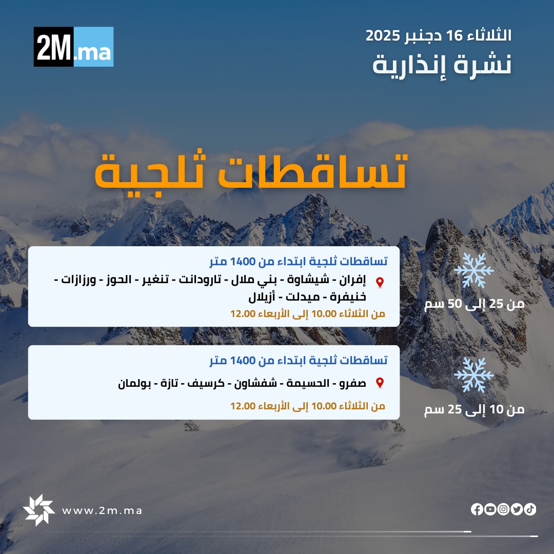 نشرة إنذارية من مستوى يقظة برتقالي. تساقطات ثلجية، وأمطار قوية أحيانا رعدية مصحوبة بحبات البرد، وهبات رياح قوية.. من اليوم الثلاثاء إلى بعد غد الخميس، بعدد من مناطق المملكة.. (المديرية العامة للأرصاد الجوية) #نشرة_إنذارية