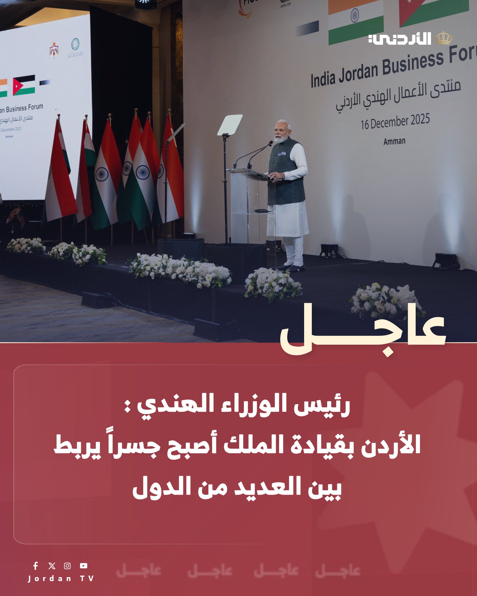 عاجل || رئيس الوزراء الهندي يؤكد اهتمام بلاده بتطوير التعاون الاقتصادي مع الأردن، لا سيما في قطاعات مثل البنية التحتية الرقمية والاتصالات، والصناعات الدوائية والأجهزة الطبية، والزراعة.. ولفت مودي إلى أن الأردن بقيادة جلالة الملك، أصبح جسرا يربط بين العديد من الدول، مؤكدا ضرورة الاستفادة من هذه الميزة لتعزيز فرص التعاون التجاري. وأضاف أنه في وقت سابق، كانت تجارة الهند إلى أوروبا تمر عبر البترا، لافتا إلى أهمية استعادة هذه المسارات من أجل تطوير النمو التجاري مستقبلا #عاجل