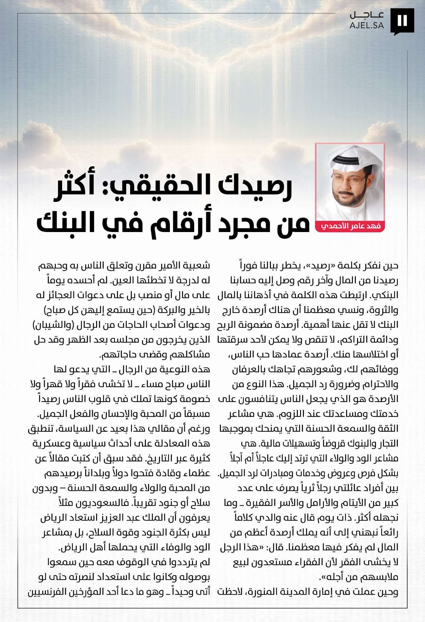 حين نفكر بكلمة "رصيد"، يخطر ببالنا فوراً رصيدنا من المال وآخر رقم وصل إليه حسابنا البنكي. ارتبطت هذه الكلمة في أذهاننا بالمال والثروة، ونسي معظمنا أن هناك أرصدة خارج البنك لا تقل عنها أهمية. أرصدة مضمونة الربح ودائمة التراكم، لا تنقص ولا يمكن لأحد سرقتها أو اختلاسها منك. أرصدة عمادها حب الناس، ووفائهم لك، وشعورهم تجاهك بالعرفان والاحترام وضرورة رد الجميل. هذا النوع من الأرصدة هو الذي يجعل الناس يتنافسون على خدمتك ومساعدتك عند اللزوم. هي مشاعر الثقة والسمعة الحسنة التي يمنحك بموجبها التجار والبنوك قروضاً وتسهيلات مالية. هي مشاعر الود والولاء التي ترتد إليك عاجلاً أم آجلاً بشكل فرص وعروض وخدمات ومبادرات لرد الجميل.