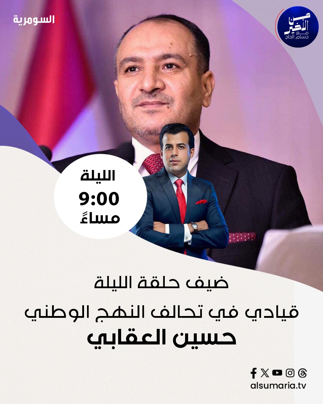 "المالكي يشبّث بعرى الثالثة".. عنوان حلقة الليلة من برنامج من الأخير مع حسام الحاج وضيوفه: القيادي في تحالف النهج الوطني حسين العقابي والنائب السابق طلال الزوبعي في تمام الساعة 9 على شاشة