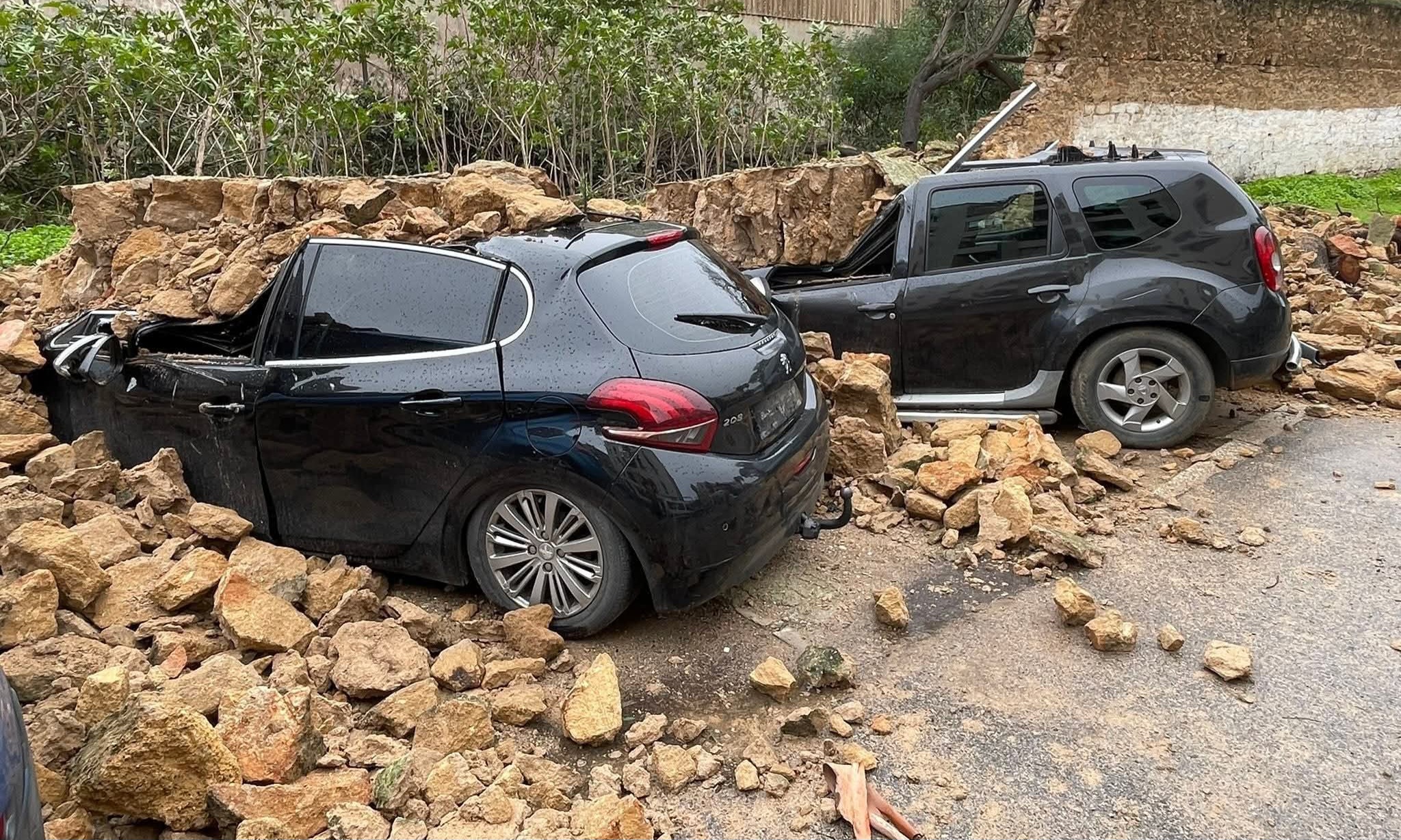 وشملت الأضرار سيارات من طرازات مختلفة حيث بدت غارقة في ركام السور الحجري المنهار.