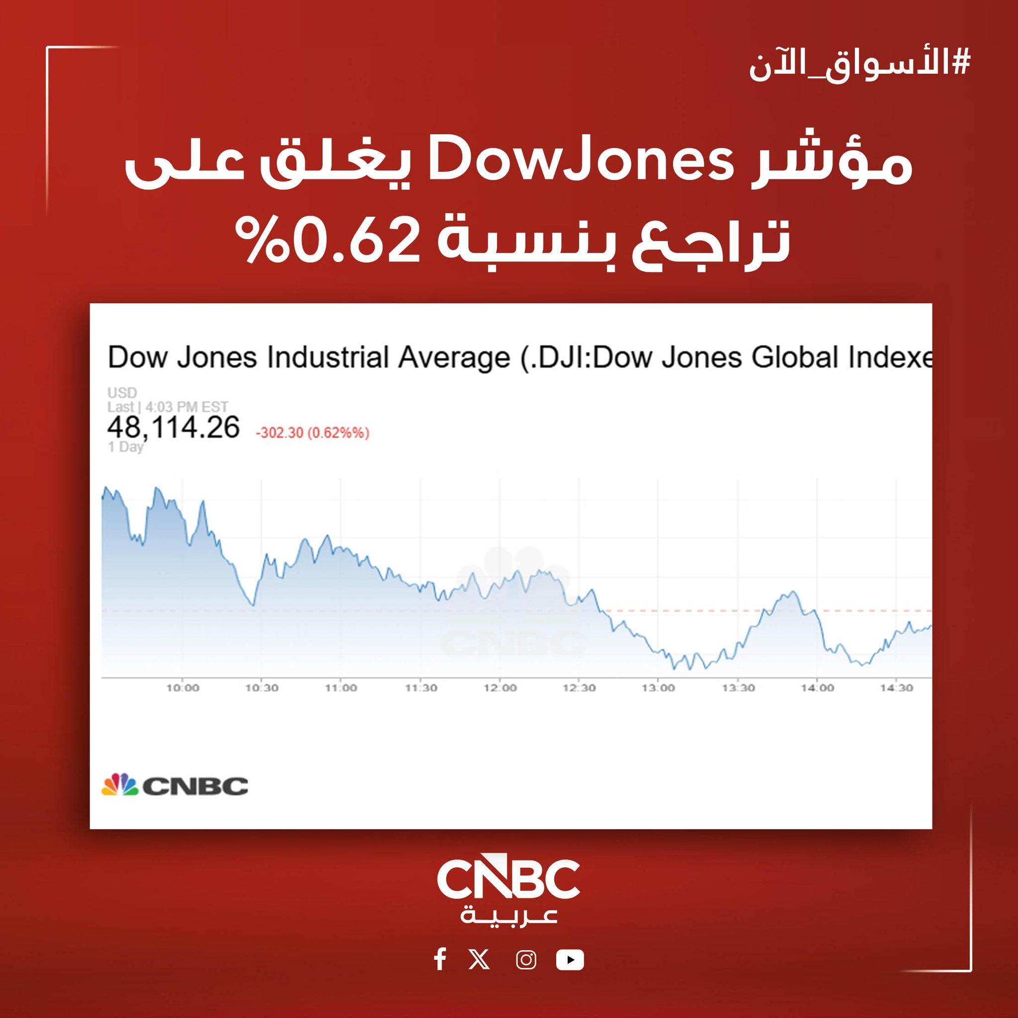 وهبط المؤشر داو جونز الصناعي 36.4 نقطة، أو 0.08 %، إلى 48380.17 نقطة