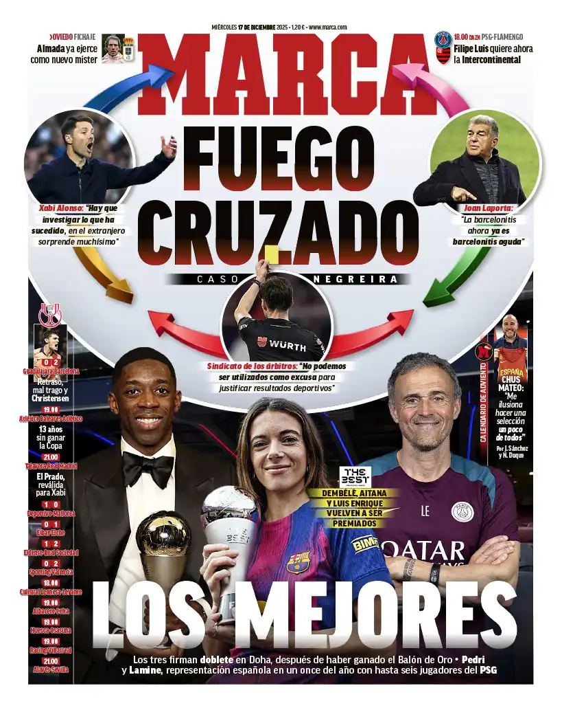 ركزت الصحيفة الإسبانية على هجوم ريال مدريد في قضية نيغريرا وتعليقات خوان لابورتا، رئيس برشلونة، وكتبت: "تبادل الاتهامات" و"خوان لابورتا: هوس ريال مدريد ببرشلونة أصبح حادًّا جدًّا".