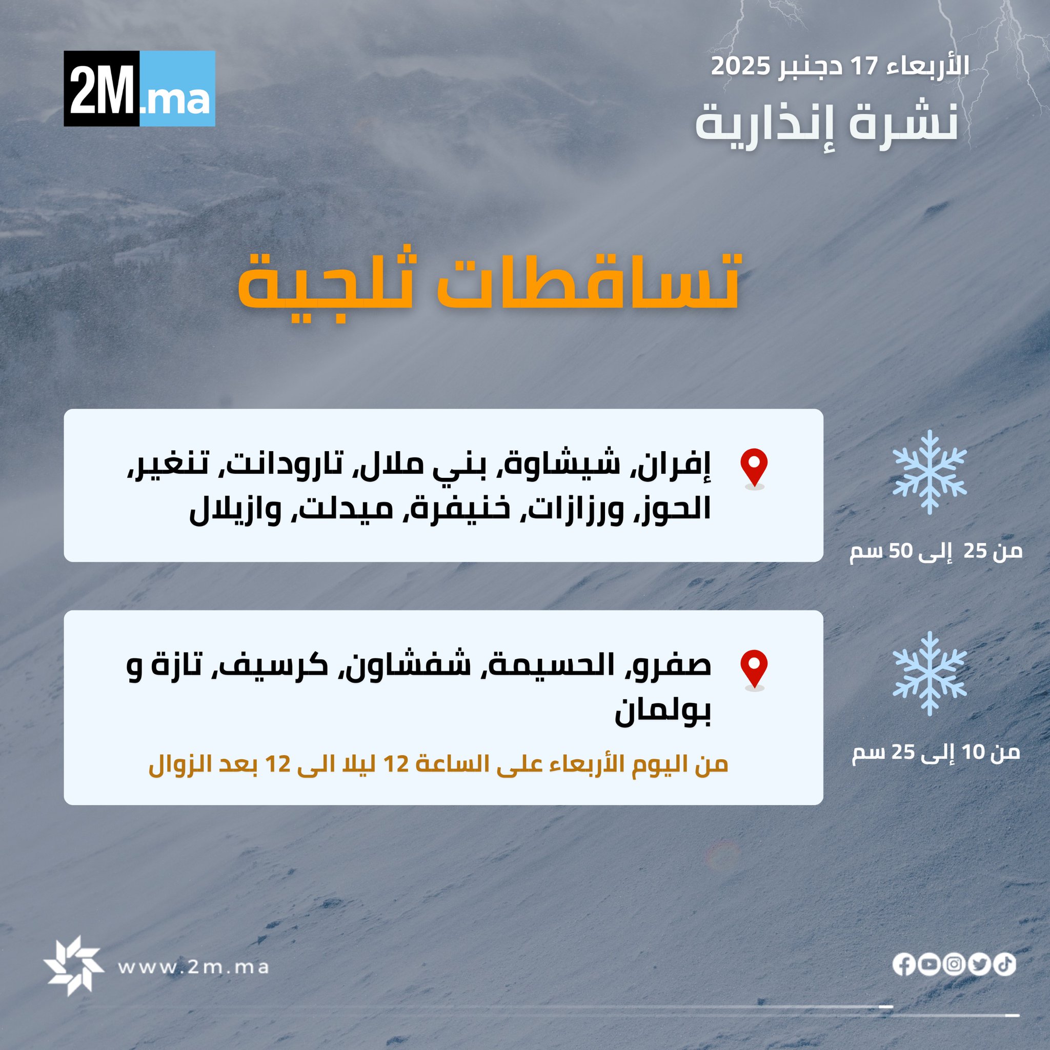تساقطات ثلجية وزخات مطرية قوية أحيانا رعدية ورياح قوية، من اليوم الاربعاء إلى الخميس.. (المديرية العامة للأرصاد الجوية) #نشرة_إنذارية