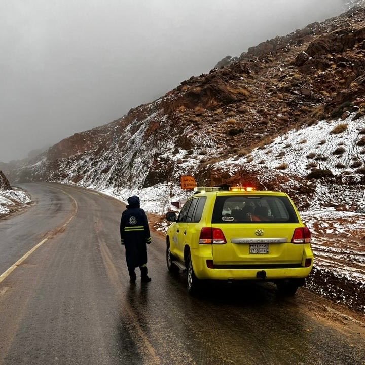 الدفاع المدني في تبوك يعزز إجراءات السلامة إثر تساقط الثلوج على #جبل_اللوز