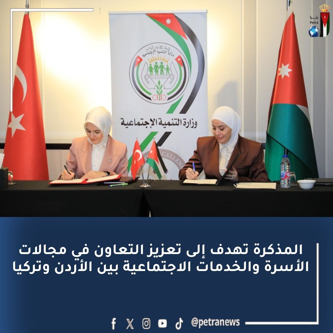 عمان 17 كانون الأول (بترا)- وقعت وزيرة التنمية الاجتماعية، وفاء بني مصطفى، ووزيرة الأسرة والخدمات الاجتماعية التركية، ماهينور أوزدمير غوكطاش، اليوم الأربعاء، مذكرة تفاهم في مجال تعزيز التعاون المشترك في مجالات الأسرة والخدمات الاجتماعية، على هامش أعمال الدورة الـ45 لمجلس وزراء الشؤون الاجتماعية العرب، والمؤتمر العربي رفيع المستوى حول تنفيذ الإعلان الصادر عن مؤتمر القمة العالمي الثاني للتنمية الاجتماعية المنعقد حاليا في عمان.