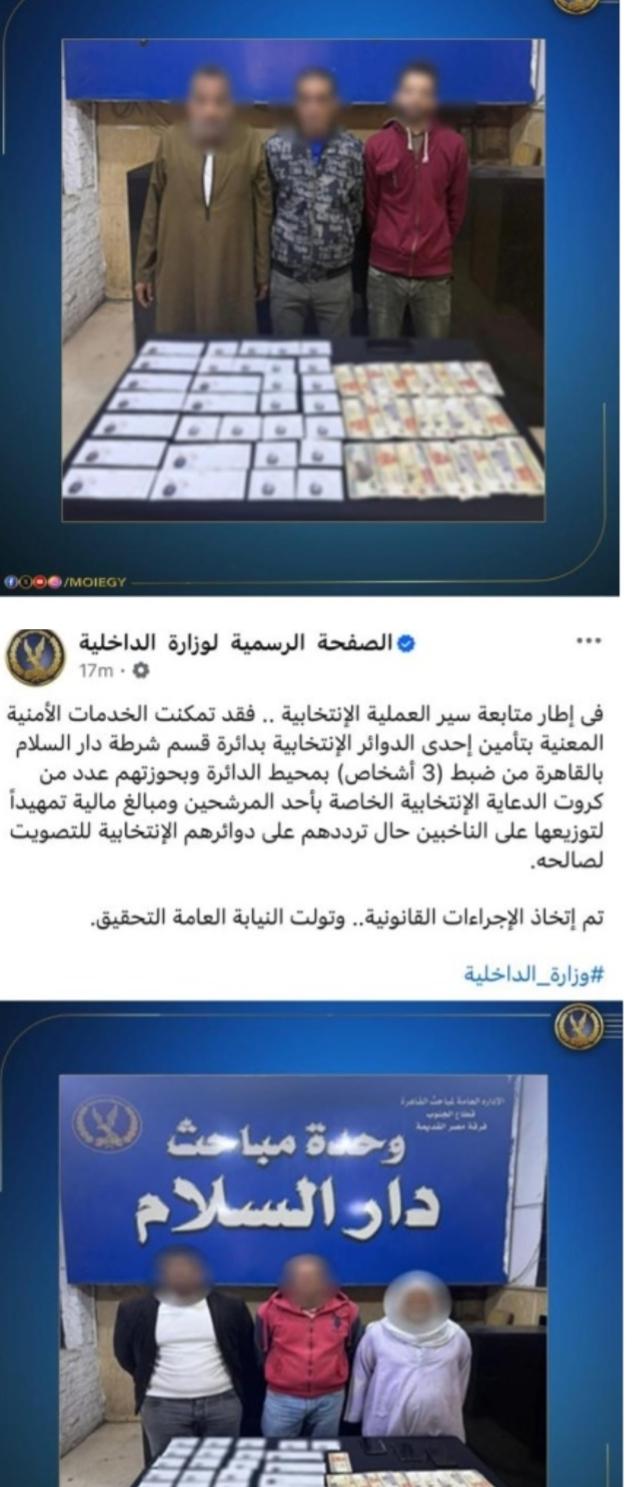 وأكد الفحص الأمني عدم صحة تلك الادعاءات جملة وتفصيلاً، وأوضح أن حقيقة الواقعة تعود إلى نجاح الأجهزة الأمنية بمديرية أمن القاهرة في ضبط عدد من أنصار المرشح المذكور متلبسين بمحيط اللجان الانتخابية بدائرة قسم شرطة دار السلام.