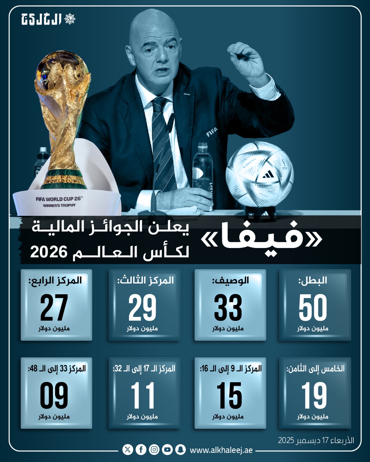 أعلن الاتحاد الدولي لكرة القدم (فيفا) أن بطل كأس العالم 2026 سيحصل على 50 مليون دولار أمريكي، في رقم قياسي جديد، على أن تنال جميع المنتخبات الـ48 المشاركة ما لا يقل عن 10.5 مليون دولار لكل منتخب.