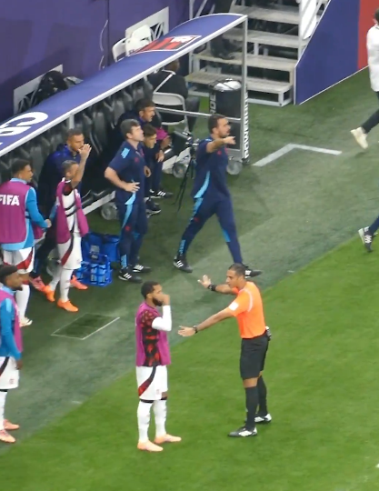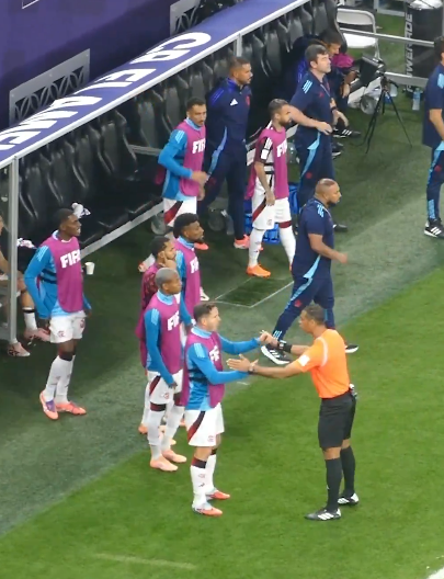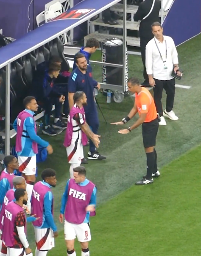 الحكم الرابع أمين عمر يقوم بتهدأ دكة بدلاء فلامنجو بسبب الاعتراضات على عدم احتساب ركلة جزاء لفريقهم أمام باريس سان جيرمان
