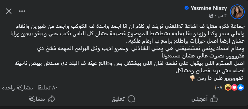 كشفت المطربة ياسمين نيازي سبب منشورها الأخير الذي أثار جدلًا واسعًا عبر مواقع التواصل الاجتماعي، بعدما ربط عدد من المتابعين بينه وبين آخر تصريحات الفنان أحمد العوضي.