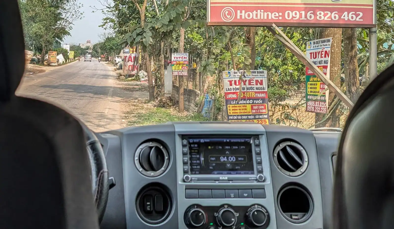 صورة تظهر شاشة مزودة بأزرار لسيارة تسير على طريق ريفي، فيتنام، 20 مارس 2025