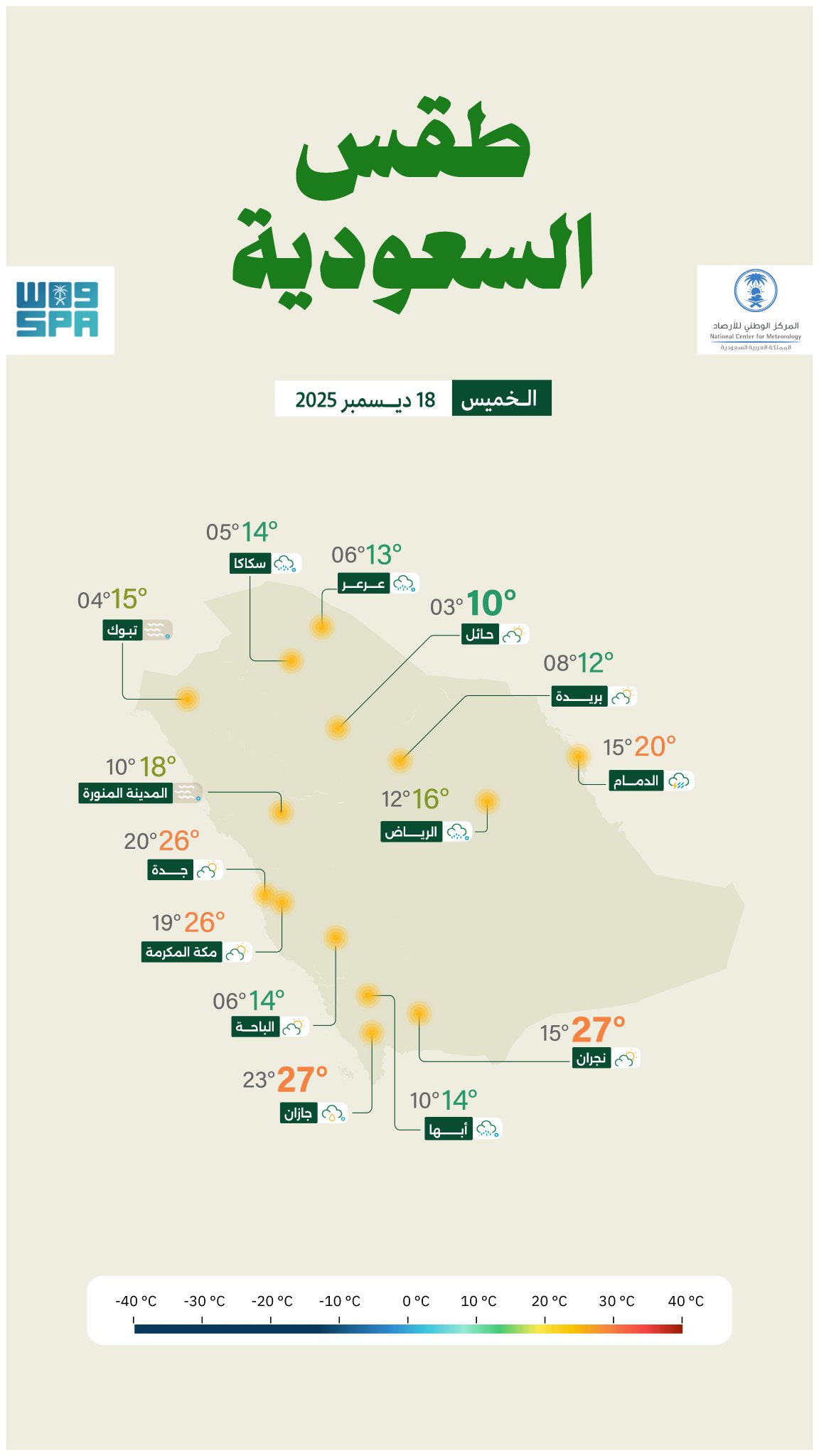 وأشار المركز، إلى احتمالية تساقط الثلوج على أجزاء من مناطق: حائل، القصيم، تمتد إلى الأجزاء الشمالية من منطقة الرياض، كما تنشط الرياح السطحية المثيرة للأتربة والغبار على معظم مناطق المملكة خاصة على الأجزاء الساحلية، في حين يكون الطقس بارد إلى شديد البرودة على شمال غرب المملكة.