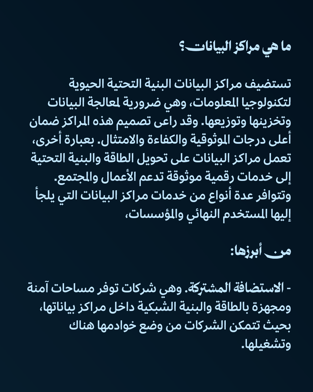 تستضيف مراكز البيانات البنية التحتية الحيوية لتكنولوجيا المعلومات، وهي ضرورية لمعالجة البيانات وتخزينها وتوزيعها. وقد راعى تصميم هذه المراكز ضمان أعلى درجات الموثوقية والكفاءة والامتثال، بحيث تبقى الخدمات متاحة على الدوام. بعبارة أخرى، تعمل مراكز البيانات على تحويل الطاقة والبنية التحتية إلى خدمات رقمية موثوقة تدعم الأعمال والمجتمع وتشكل العمود الفقري لاقتصادنا الرقمي. وتتوفر عدة أنواع من خدمات مراكز البيانات التي يلجأ إليها المستخدم النهائي والمؤسسات، من أبرزها: