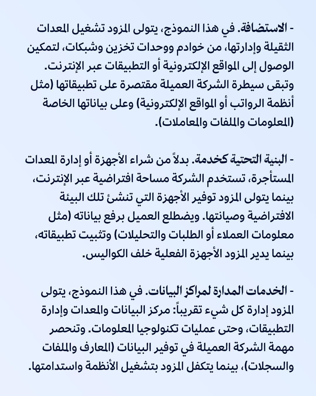 الخدمات المدارة لمراكز البيانات: في هذا النموذج، يتولى المزود إدارة كل شيء تقريباً: مركز البيانات والمعدات وإدارة التطبيقات، وحتى عمليات تكنولوجيا المعلومات. وتنحصر مهمة الشركة العميلة في توفير البيانات (المعارف والملفات والسجلات)، بينما يتكفل المزود بتشغيل الأنظمة واستدامتها. وتتمثل الفائدة الرئيسة لهذا النموذج في تمكين الشركات من إسناد البنية السحابية وإدارتها بالكامل إلى مزود متخصص يقدم دعماً احترافياً على مدار الساعة، ما يقلل حاجتها إلى فرق تقنية داخلية كبيرة.