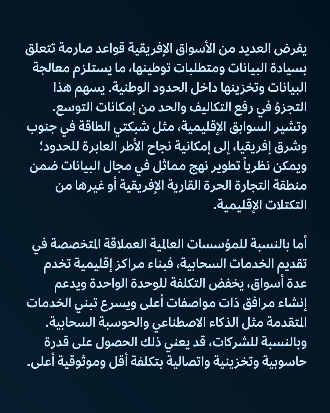 يفرض العديد من الأسواق الإفريقية قواعد صارمة تتعلق بسيادة البيانات ومتطلبات توطينها، ما يستلزم معالجة البيانات وتخزينها داخل الحدود الوطنية. يسهم هذا التجزؤ في رفع التكاليف والحد من إمكانات التوسع. وتشير السوابق الإقليمية، مثل شبكتي الطاقة في جنوب وشرق إفريقيا، إلى إمكانية نجاح الأطر العابرة للحدود، ويمكن نظرياً تطوير نهج مماثل في مجال البيانات ضمن منطقة التجارة الحرة القارية الإفريقية أو غيرها من التكتلات الإقليمية. ويتمثل التحدي في تحقيق التوازن بين السيادة والتكامل، ما يتيح تدفقات بيانات موثوقة مع صون المصالح الوطنية في الوقت نفسه.