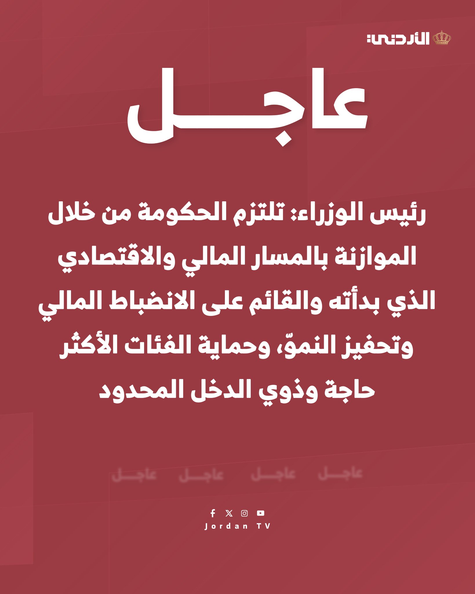 رئيس الوزراء: تلتزم الحكومة من خلال الموازنة بالمسار المالي والاقتصادي الذي بدأته والقائم على الانضباط المالي وتحفيز النموّ، وحماية الفئات الأكثر حاجة وذوي الدخل المحدود #الأردن