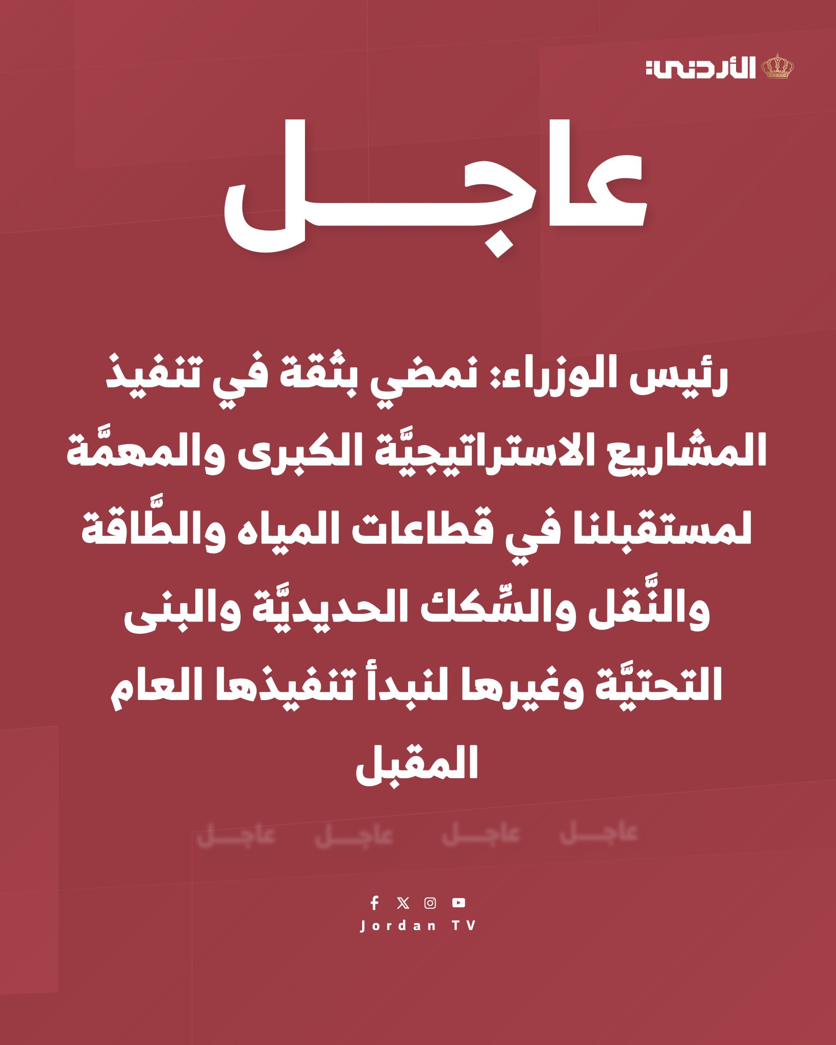 رئيس الوزراء: نمضي بثقة في تنفيذ المشاريع الاستراتيجيَّة الكبرى والمهمَّة لمستقبلنا، في قطاعات المياه والطَّاقة والنَّقل والسِّكك الحديديَّة والبنى التحتيَّة وغيرها؛ لنبدأ تنفيذها العام المقبل #الأردن