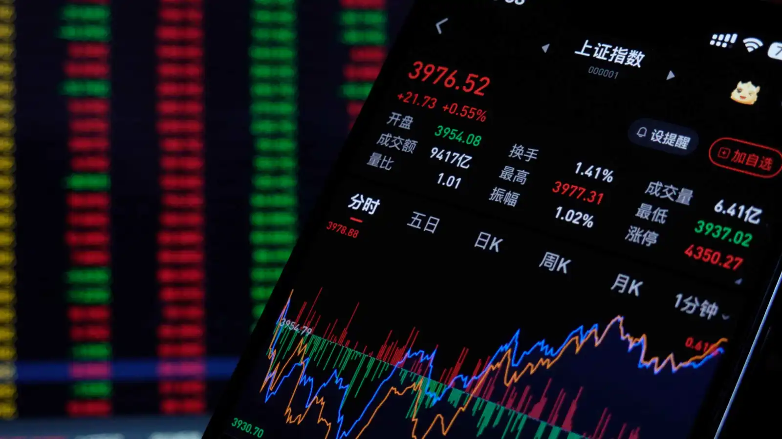 بيانات نقاط إغلاق مؤشر شنغهاي المركب للصين على هاتف ذكي داخل قاعة تداول في هايان، الصين - 3 نوفمبر 2025