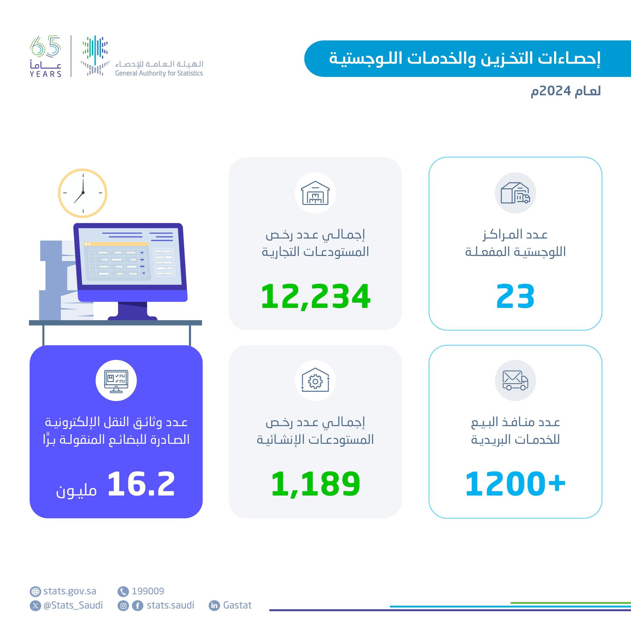 الهيئة العامة للإحصاء : ارتفاع عدد المراكز اللوجستية إلى (23) مركزًا في عام 2024م، بمساحة إجمالية بلغت (34.6) مليون متر مربع مقارنة بـ(22) مركزًا في عام 2023م، وسجّلت مكة المكرمة أعلى مساحة بواقع (20.4) مليون متر مربع موزعة على ستة مراكز