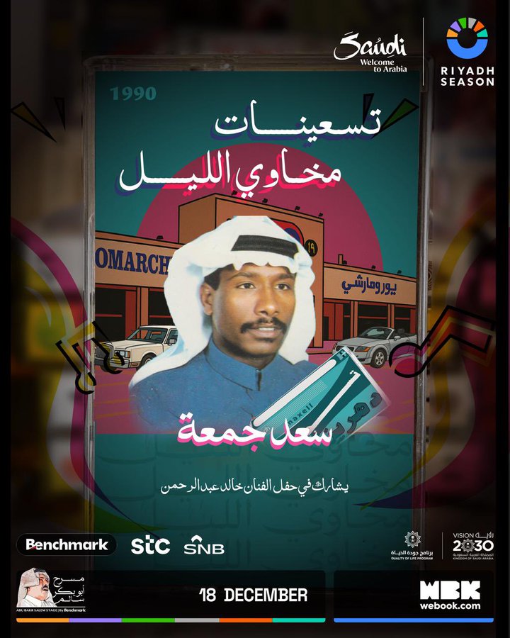 البلاد | الليلة.. مفاجآت تسعينات مخاوي الليل. الفنان سعد جمعة يشارك في الحفل المميز للفنان خالد عبدالرحمن ضمن حفلات موسم الرياض. متابعة صحيفة البلاد | بنش مارك | | |