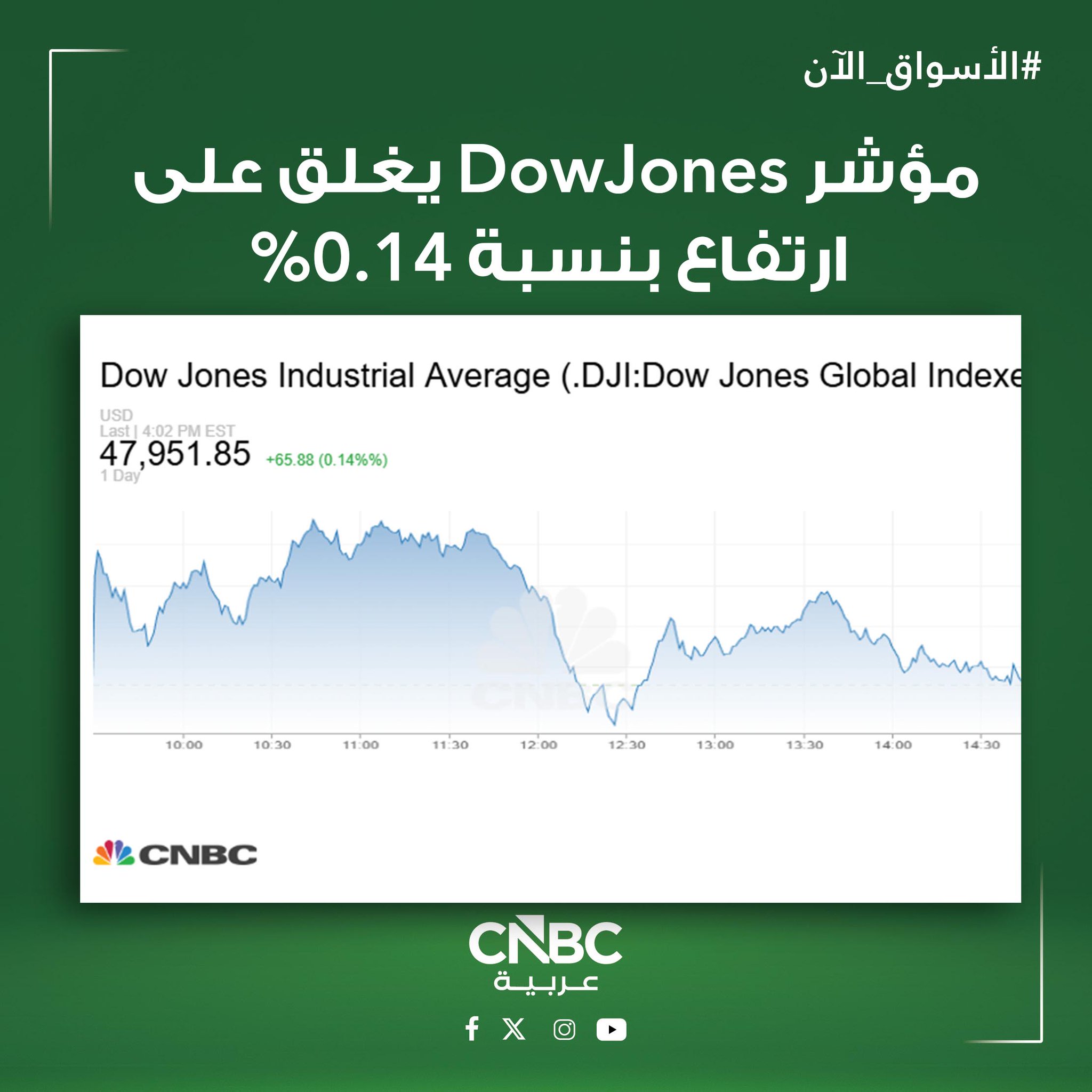 الأسواق الآن| ارتفاعات جماعية في ختام جلسة الخميس 18 ديسمبر/ كانون الأول في وول ستريت، بدعم من بيانات تضخم أميركية أقل من المتوقع لشهر نوفمبر، مما عزز التوقعات بانخفاض معدلات الفائدة في عام 2026 - مؤشر Dow Jones يرتفع بنحو 0.14% - مؤشر SP 500 يغلق على ارتفاع بنسبة 0.79% - مؤشر يصعد بنحو 1.38%. للمزيد عن الأسواق