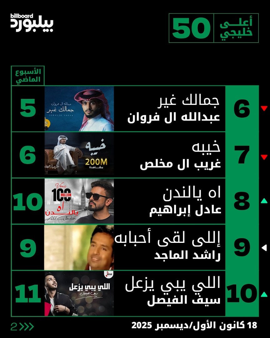 أغنية يا طير يا خافق الريش لأميمة طالب تواصل الصعود على قائمة أعلى 50 خليجي، محققة قفزة بـ 10 مراكز هذا الأسبوع. تعرّفوا على تفاصيل مراتب القائمة كاملة في قسم القوائم عبر موقعنا. #قوائم_بيلبورد