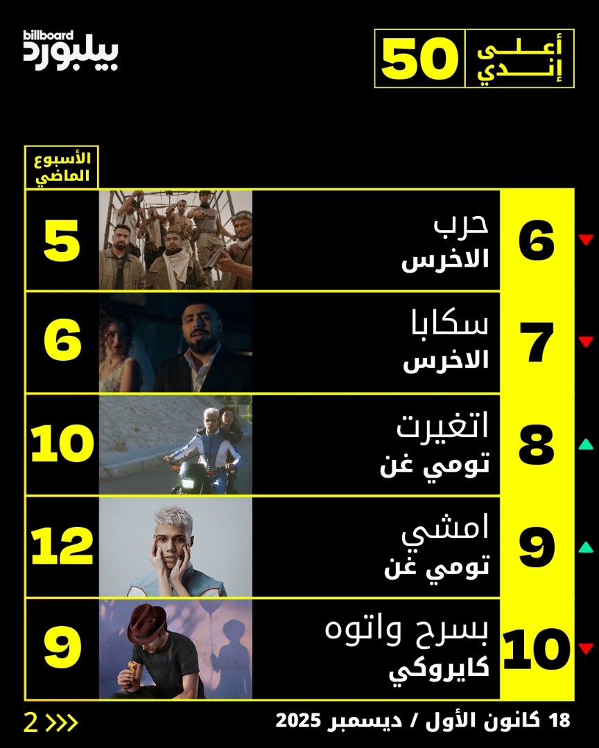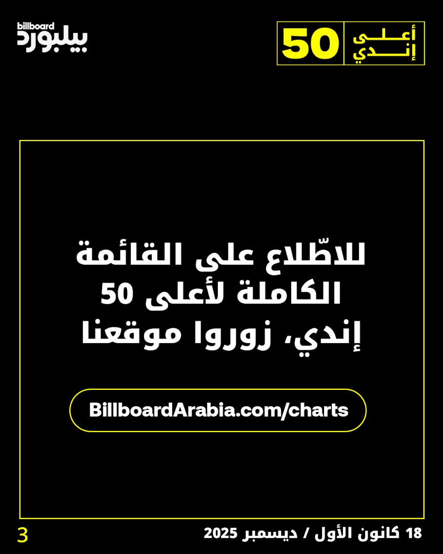 الهدوء يسيطر على قائمة بيلبورد عربية أعلى 50 إندي هذا الأسبوع، مع صعود طفيف لأغنية النية لليجي سي.. اكتشفوا باقي المراتب وتفاصيل القائمة كاملة في موقعنا. #قوائم_بيلبورد