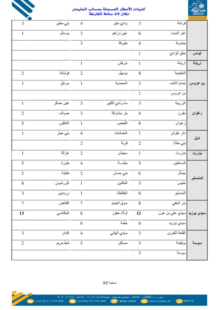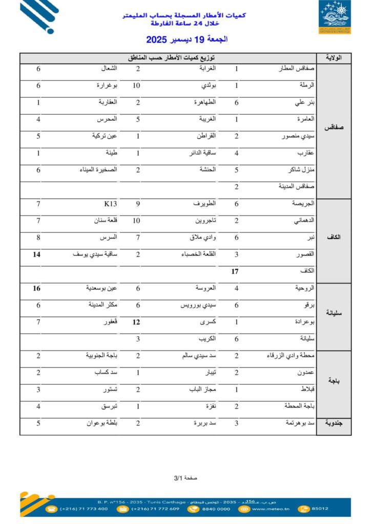 نشر المعهد الوطني للرصد الجوي قائمة كميات الأمطار المسجلة من يوم الخميس 18ديسمبر 2025 على الساعة 07 الى يوم الجمعة 19 ديسمبر 2025 على الساعة 07 :
