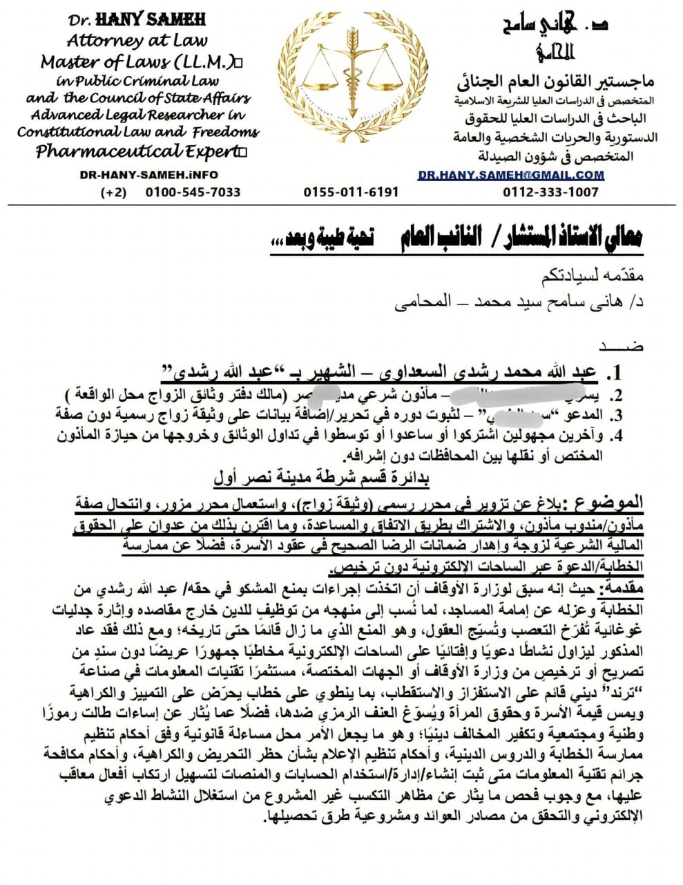 تقدم محامي ببلاغ عاجل للنائب العام ضد عبد الله رشدي قُيِّد برقم 1480327، مطالبًا بفتح تحقيق فيما وصفه البلاغ بوقائع تزوير في محرر رسمي (وثيقة زواج) واستعمال محرر مزور وانتحال صفة مأذون أو مندوب مأذون والاشتراك بطريق الاتفاق والمساعدة، وذلك على خلفية وقائع قال إنها تمس الثقة العامة في محررات الأحوال الشخصية وضمانات الرضا الصحيح في عقود الأسرة وما يترتب عليها من حقوق مالية للزوجة.