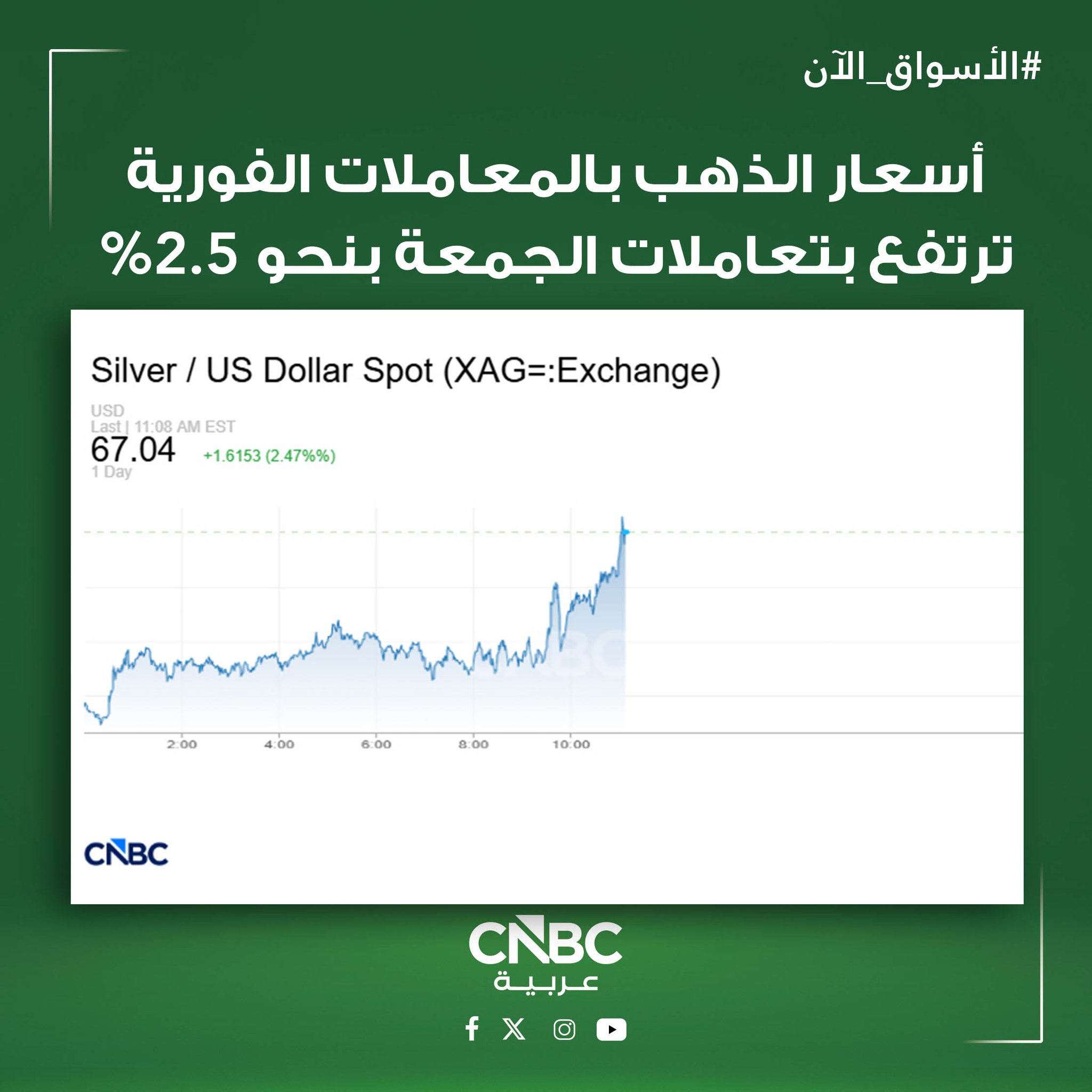 الأسواق الآن: أسعار الفضة في المعاملات الفورية تواصل الصعود وتتجاوز مستوى 67 دولاراً للأونصة لأول مرة على الإطلاق. أسعار الفضة في المعاملات الفورية بنسبة 2.47% إلى 67.04 دولاراً للأونصة، ومن المتوقع أن يختتم الأسبوع بأكثر من 7%. ارتفاع الفضة مدفوع باهتمام المستثمرين بصناديق المؤشرات المتداولة، بحسب ما نقلته وكالة رويترز عن الرئيس العالمي لاستراتيجية السلع في شركة TD Securities، بارت ميليك
