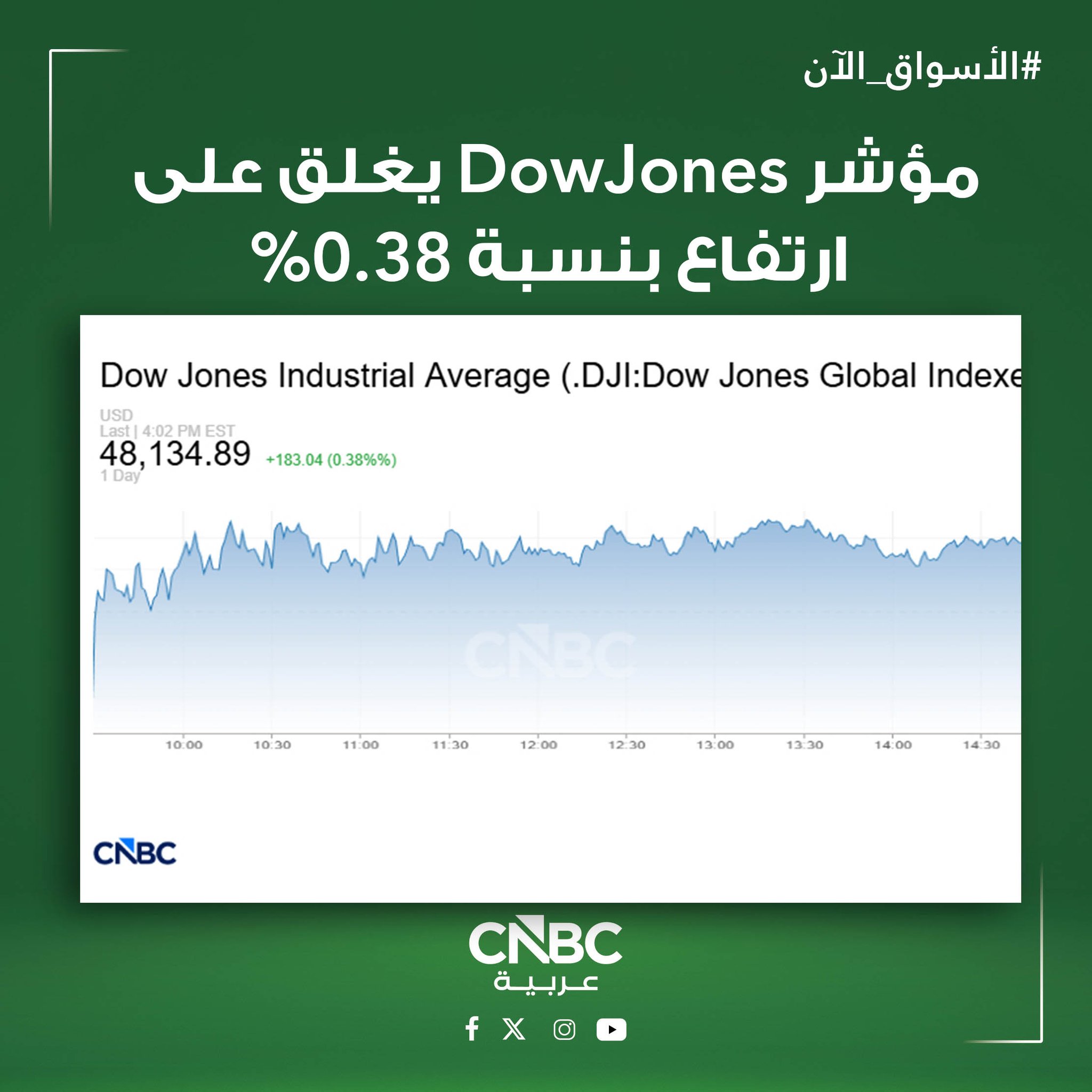 وتقدم مؤشر داو جونز الصناعي بمقدار 183 نقطة، أو بنسبة 0.3%، مسجلاً 48.134.89 نقطة عند الإغلاق.