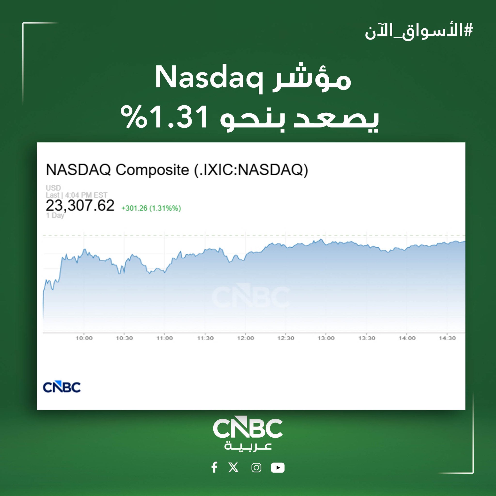 ارتفع مؤشر ناسداك المركب بنسبة 1.3%، عند الإغلاق مسجلاً 23.307.62 نقطة.