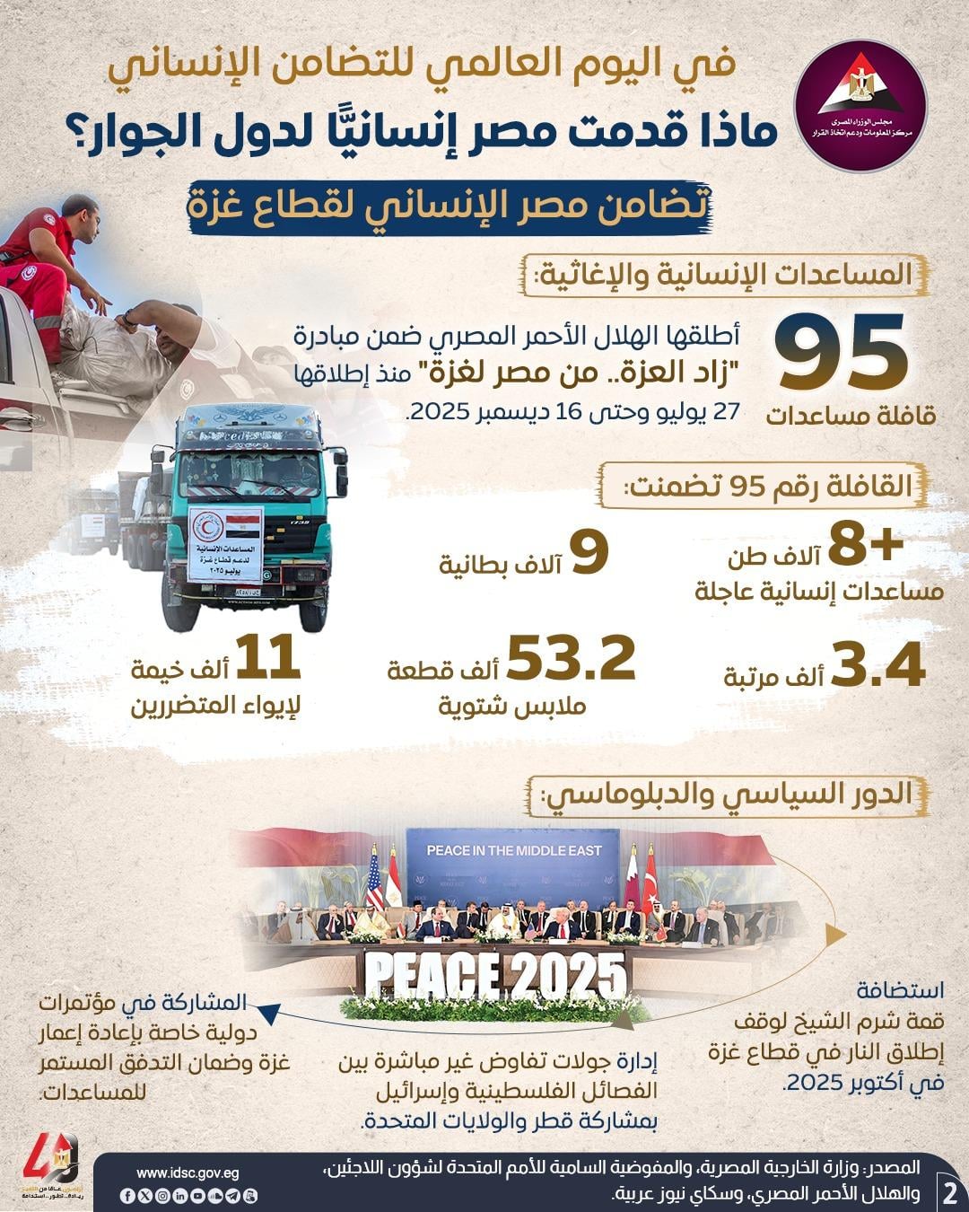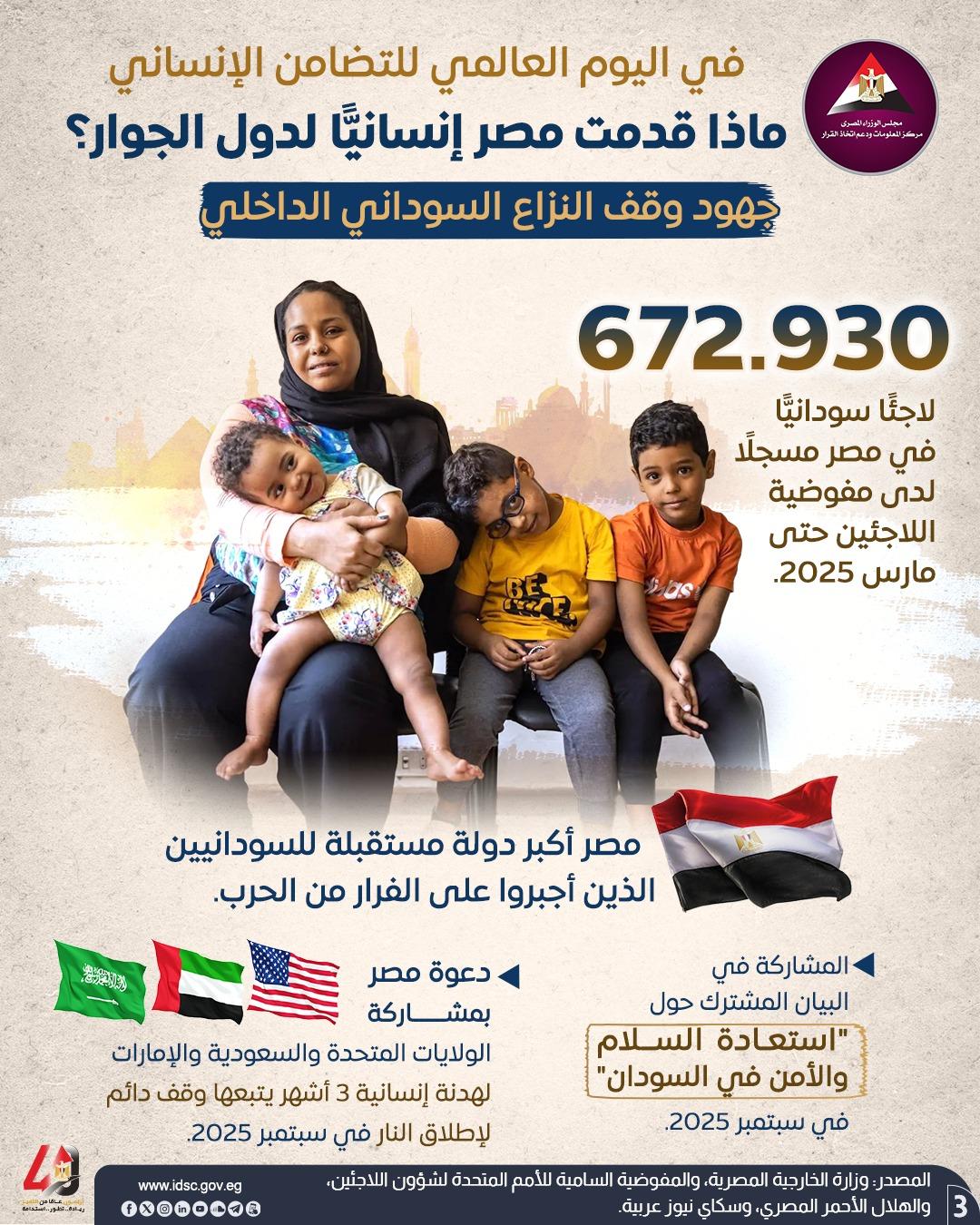 نشر مركز المعلومات ودعم اتخاذ القرار بمجلس الوزراء إنفوجرافًا، بالتزامن مع اليوم العالمي للتضامن الإنساني الموافق 20 ديسمبر، استعرض من خلاله أبرز جهود مصر في دعم العمل الإنساني إقليميًا ودوليًا.