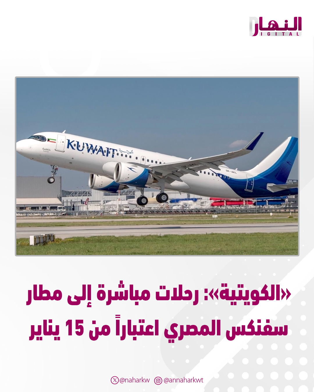 (كونا) -- أعلنت شركة الخطوط الجوية الكويتية اليوم السبت إطلاق رحلاتها المجدولة المباشرة إلى مطار (سفنكس) الدولي في جمهورية مصر العربية اعتبارا من 15 يناير المقبل بواقع ثلاث رحلات أسبوعيا أيام الأحد والثلاثاء والخميس.