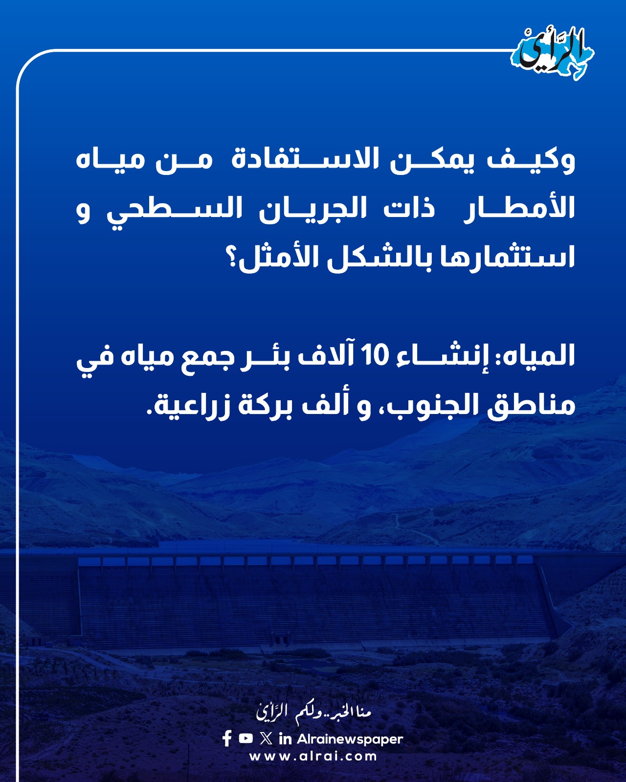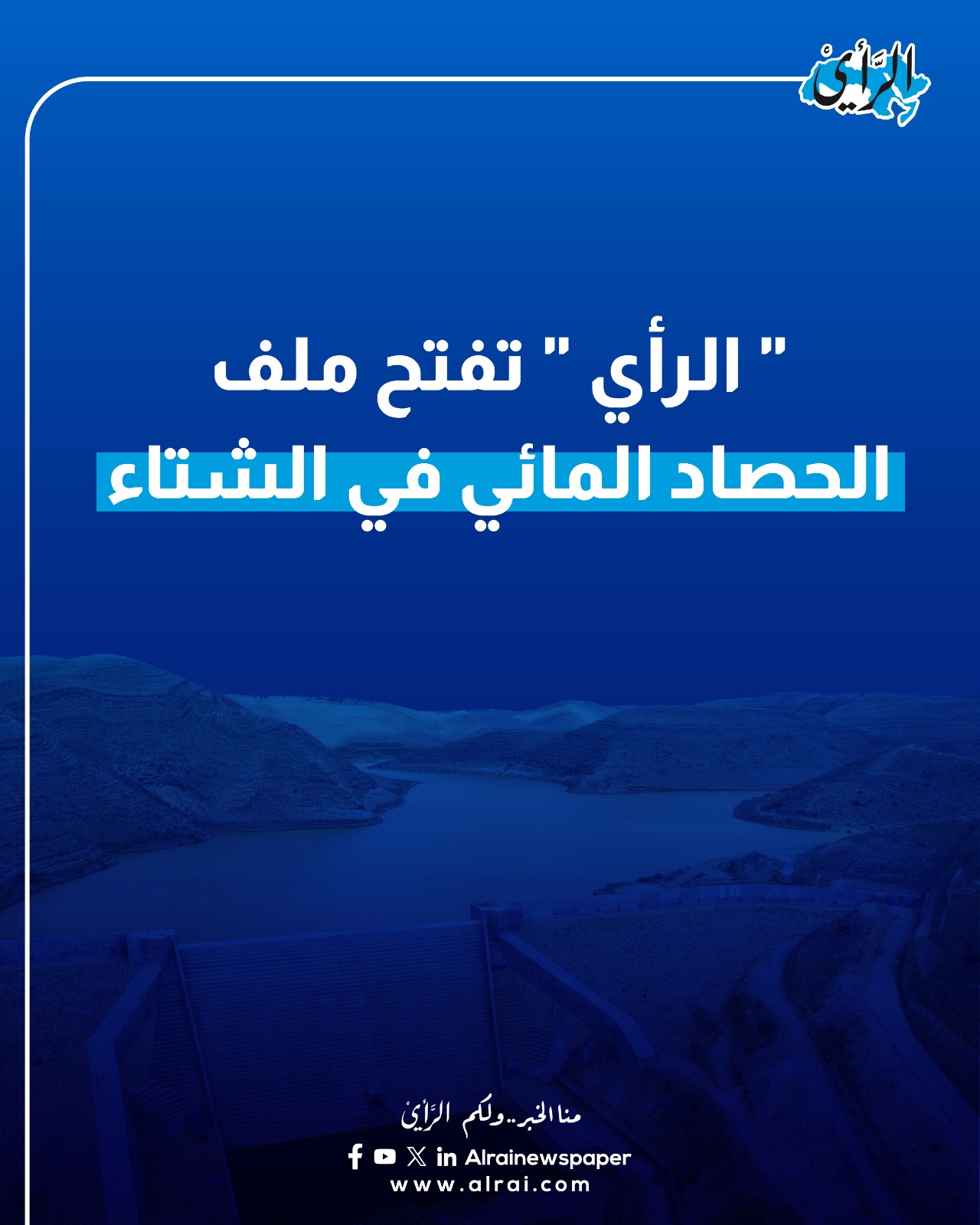 " الرأي " تفتح ملف الحصاد المائي في الشتاء. تفاصيل الملف في عدد الرأي الورقي يوم الاحد. كيف يمكن استثمار مياه الأمطار من أجل صيف مائي آمن؟. كيف يمكن للمواطنين المشاركة في استثمار مياه التجميع المطري لتخزينها واستخدامها صيفا؟. هل السدود الترابية تكفي لسد الاحتياجات للاستخدامات الزراعية خصوصا في الزراعات الصيفية؟. مع هطول امطار غزيرة في اوائل الشتاء ، وامتلاء معظم السدود والحفائر هل نحتاج لسدود إضافية وكيف يمكن تمويلها؟. وكيف يمكن الاستفادة من مياه الأمطار ذات الجريان السطحي و استثمارها بالشكل الأمثل؟. المياه: إنشاء 10 آلاف بئر جمع مياه في مناطق الجنوب، و ألف بركة زراعية. #الأردن