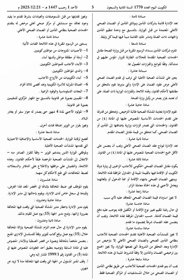مادة ثانية: لا يجوز منح الإقامة أو تجديدها، إلا بعد الحصول على تأمين صحي أو ضمان صحي حكومي أو أهلي.
