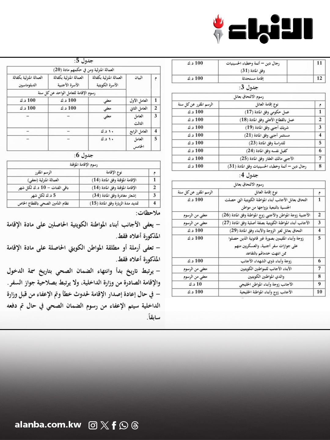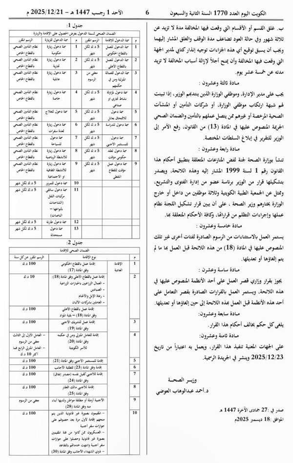 وحدد القرار الذي يدخل حيز التنفيذ اعتباراً من بعد غد 23 ديسمبر 2025 مبلغ 100 دينار الرسم المقرر للضمان الصحي لكل سنة لتجديد إقامة العمل بالقطاع الحكومي مادة 17 وإقامة العمل بالقطاع الأهلي مادة 18 وإقامة عمل للشريك الأجنبي مادة 19 وإقامة العمل للمستثمر الأجنبي وفق المادة 21 وإقامة وفق المادة 23 للطلبة الأجانب وإقامة الأجنبي كفيل نفسه وفق المادة 24 وإقامة المقيمين بصورة غير قانونية الذين يتم منحهم إقامة لأول مرة بعد حصولهم على جوازات سفر أجنبية، والعسكريون ممن كانوا من فئة بصورة غير قانونية وحصلوا على جوازات سفر أجنبية، وانتهت خدمتهم بالتقاعد، وذوي الشهداء الأجانب وفق المادة 30.