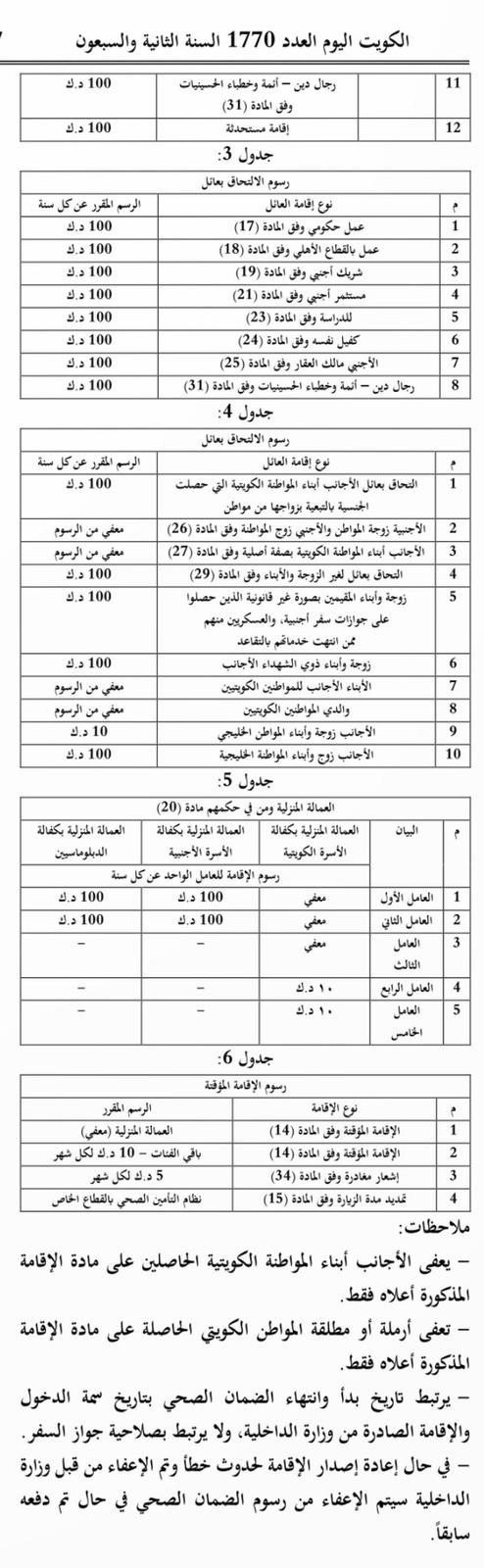 وأعفى القرار من الرسوم الأجنبية أرملة أو مطلقة مواطن ولديها أبناء، والعامل المنزلي الأول حتى الثالث، في حين حدد من الرابع فما أكثر عشرة دنانير لكل سنة.