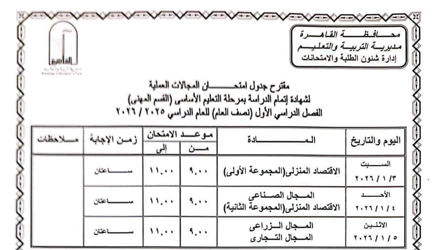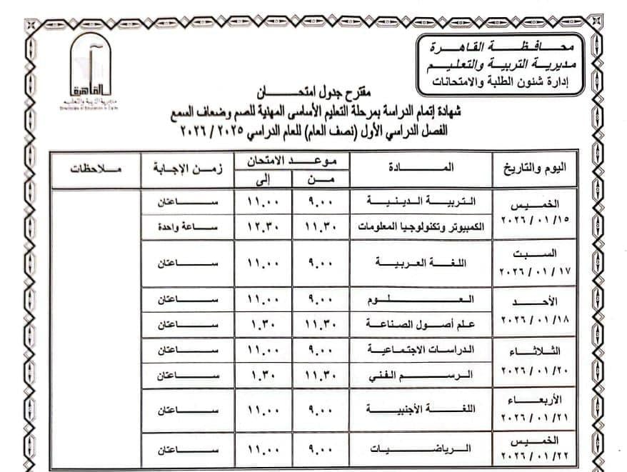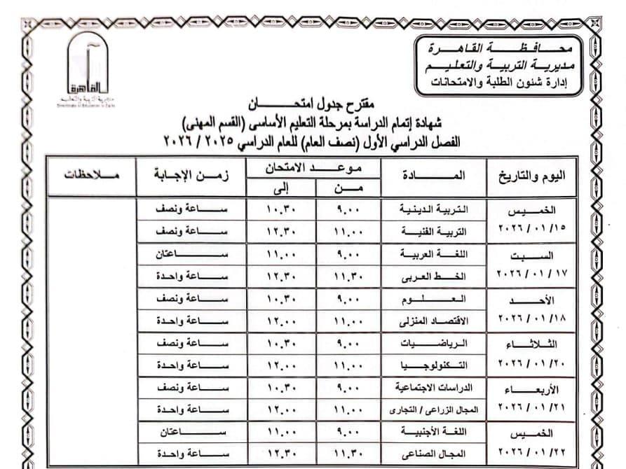 اعتمد الدكتور إبراهيم صابر، محافظ القاهرة، جدول امتحانات الفصل الدراسي الأول للعام الدراسى 2025 / 2026.