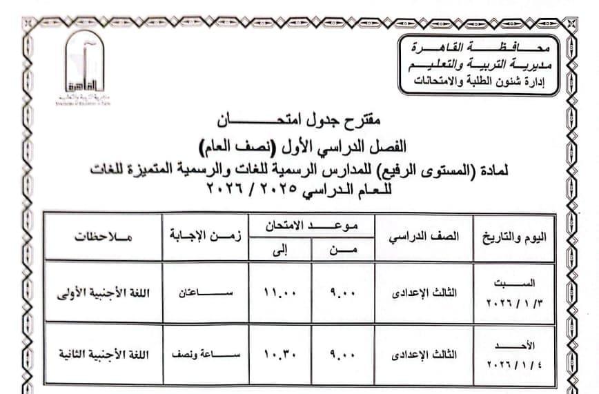وأشارت الدكتورة همت أبو كيلة، مدير مديرية التربية والتعليم بالقاهرة، إلى أنه ستعقد امتحانات المستوى الرفيع، والمواد التى لا تضاف إلى المجموع لصفوف النقل يومي السبت 3 يناير، والأحد 4 يناير 2026، وسيؤدي طلبة وطالبات الصف الثالث الابتدائي وما يعادله الإمتحانات في الفترة من السبت 10 يناير حتى الإثنين 12 يناير، بينما يؤدى طلبة وطالبات.....