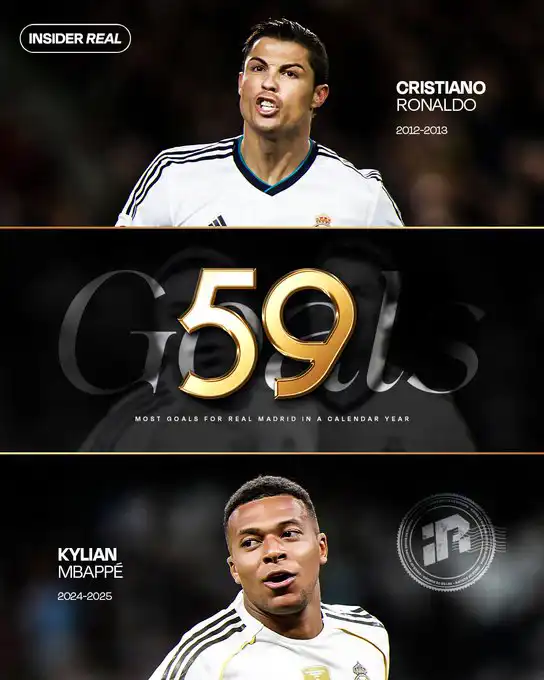 ما القصة؟ في ليلة عيد ميلاده الـ27، وصل كيليان مبابي إلى 59 هدفًا في عامه الأول الكامل مع ريال مدريد، معادلًا بذلك رقم كريستيانو رونالدو القياسي المسجل عام 2013.