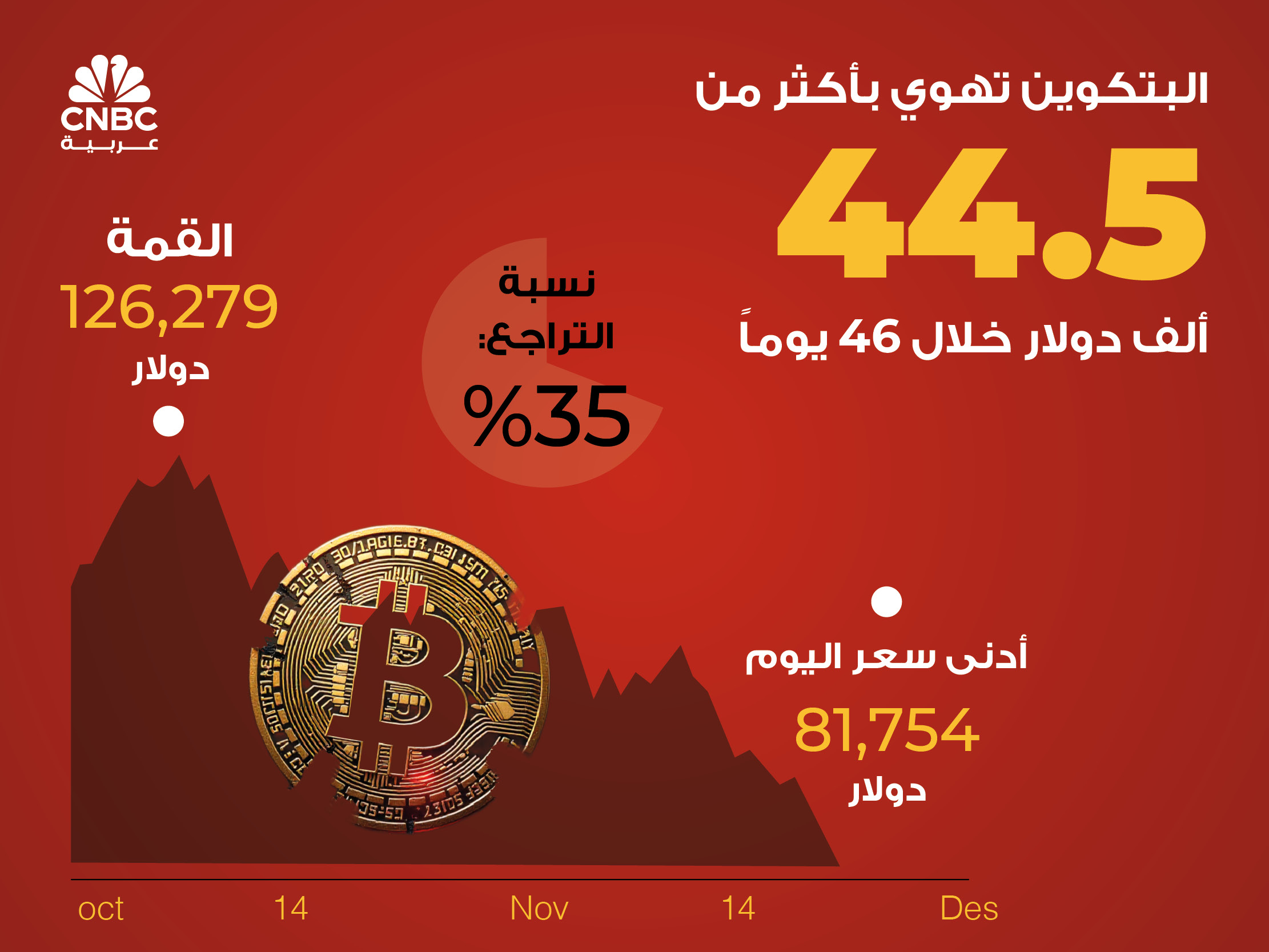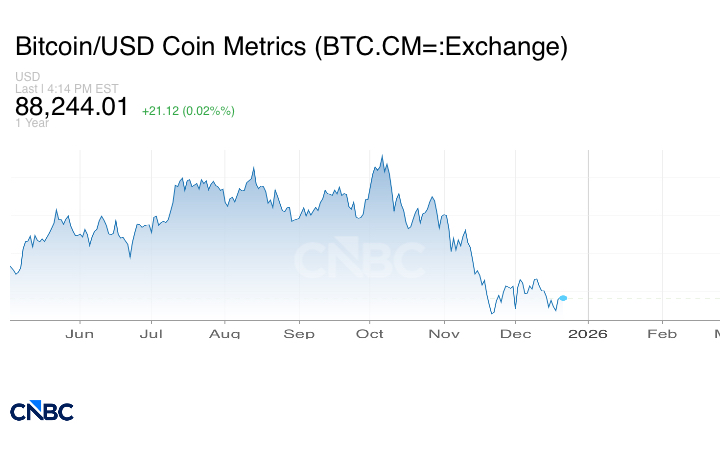 خلال هذا العام الذي اقترب من أيامه الأخيرة، تجاوز سعر البتكوين 125.000 دولار أميركي في أكتوبر/تشرين الأول قبل أن يشهد عدة انخفاضات حادة، من ذروته إلى أدنى مستوى له، بانخفاض يزيد عن 40.000 دولار عن أعلى مستوى قياسي له.