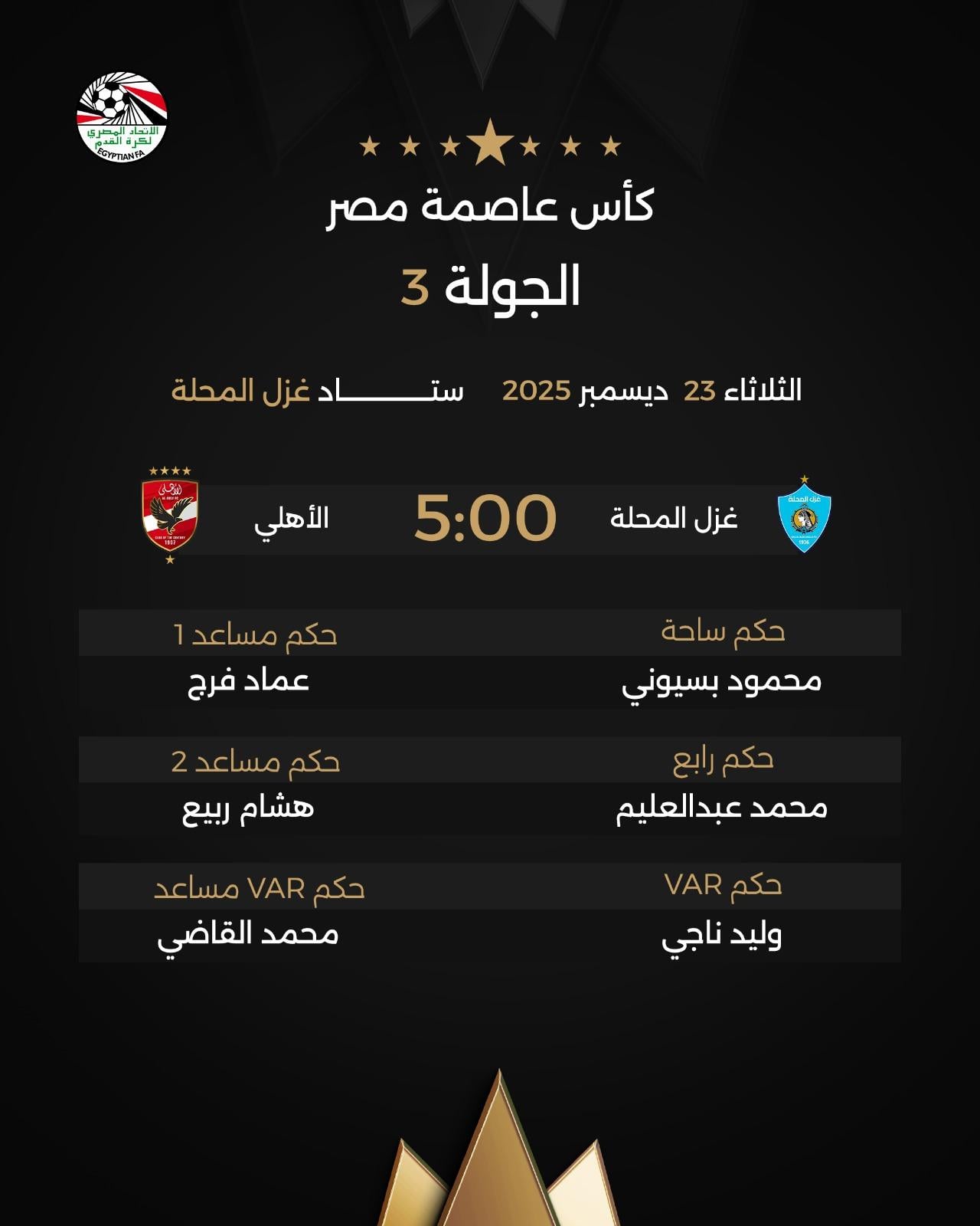 أعلن الاتحاد المصري لكرة القدم حكام مباراتي غزل المحلة والأهلي، ومودرن سبورت ووادي دجلة، المقرر لهما غدا في كأس عاصمة مصر.